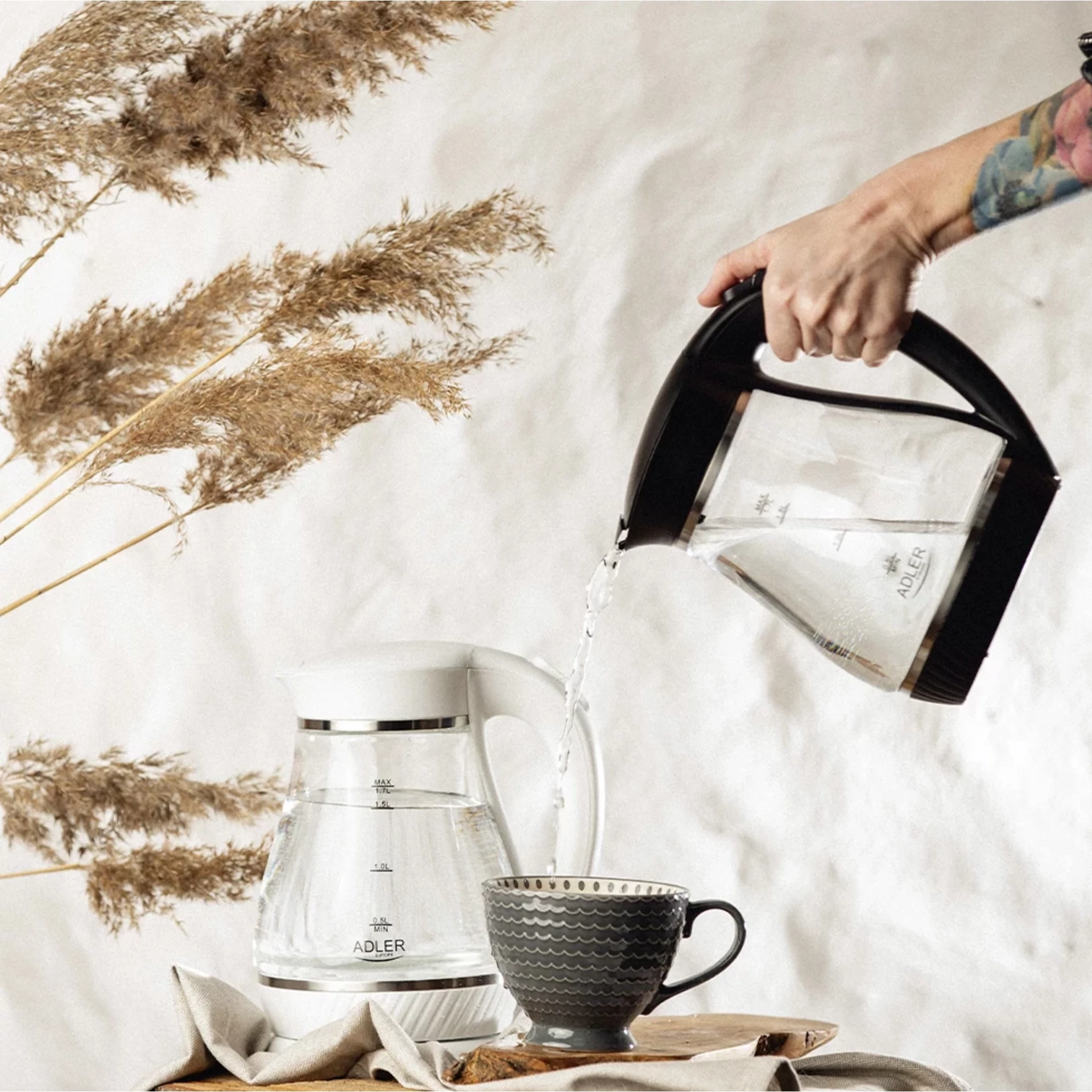 Veľká elektrická rodinná kanvica v tradičnom tvare džbánu v modernom prevedení. Vďaka výkonu 2200 W umožňuje naraz uvariť vodu pre 6-7 osôb. Kanvica je vybavená jasným ukazovateľom hladiny vody a automatickým vypnutím, takže sa po zovretí vody vypne. Ochrana proti zovretiu nasucho zabraňuje zapnutiu prázdnej kanvice, čo šetrí energiu a zvyšuje bezpečnosť používateľa. Pre pohodlie používateľa je kanvica vybavená otočnou základňou o 360 stupňov a plochým dnom. Biely a neagresívny dizajn. Umožňuje uvariť až 1,7 l vody. Vybavená vykurovacím telesom z vysoko kvalitnej nehrdzavejúcej ocele a kontrolkou informujúcou o zovretí vody.