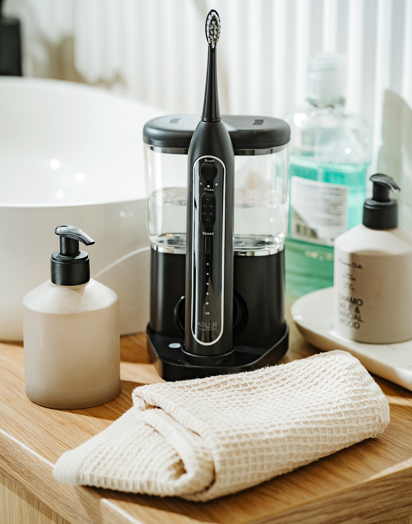 Nádržka na vodu s objemom 500 ml zaisťuje dlhé čistenie bez nutnosti častého dopĺňania. Zariadenie sa dodáva s praktickým stojanom, ktorý udrží vašu kúpeľňu upratanú a uľahčí skladovanie zubnej kefky a vodnej vaty.