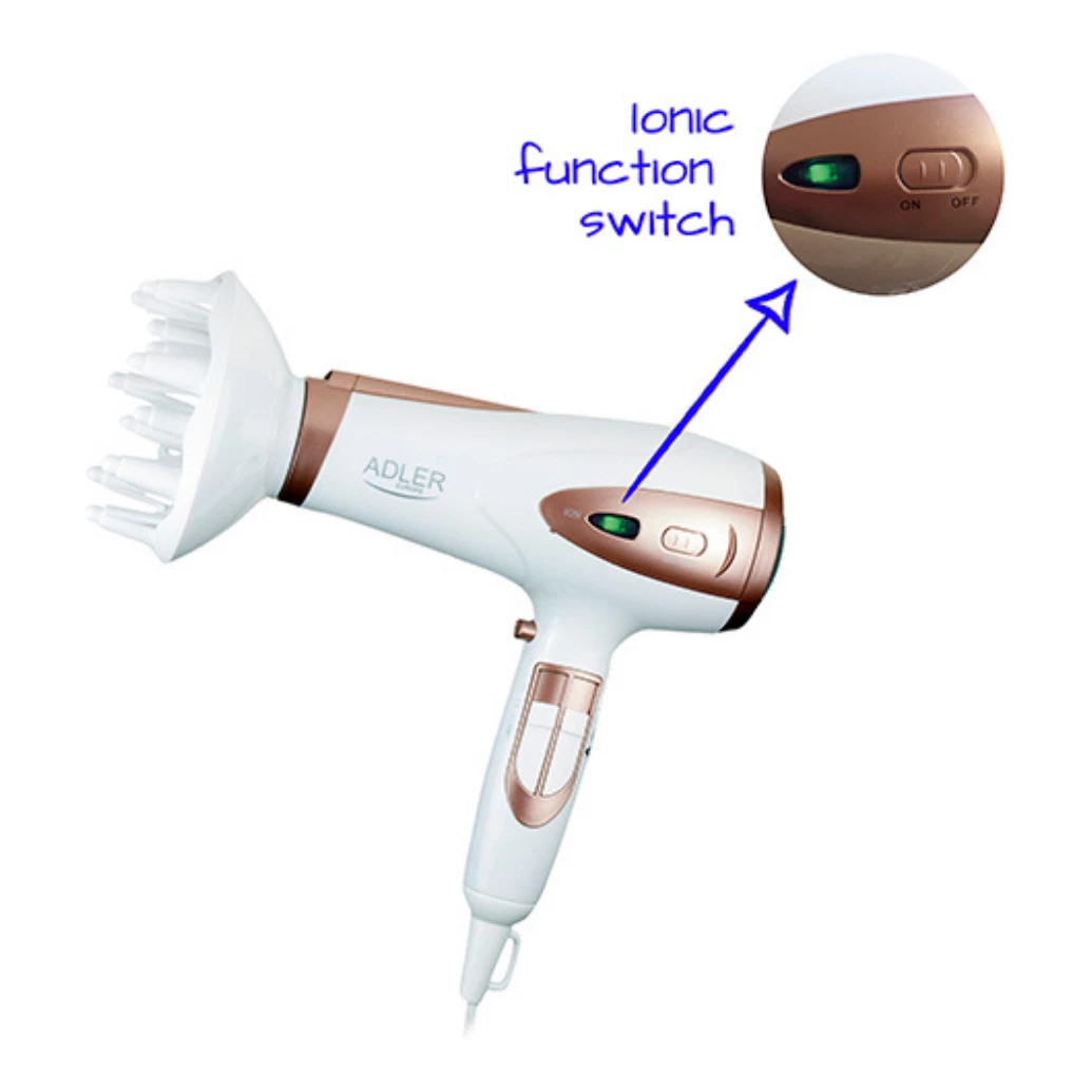 * Elektronický ionizátor produkuje negatívne ióny, ktoré neutralizujú kladné ióny vo vzduchu. Proces neutralizácie iónov uzatvára šupiny vlasov, znižuje tendenciu ku krúteniu a statickej elektrine a dodáva vlasom lesk.