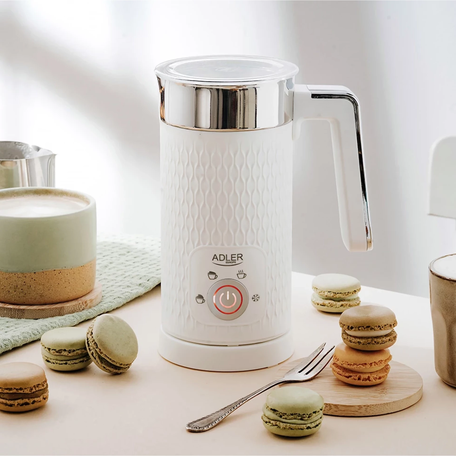 Napeňovač mlieka ADLER AD 4494 je zariadenie, ktoré vám umožní pripraviť si vlastnú penu do kávy ako z tej najlepšej kaviarne. Skvele sa bude hodiť na prípravu peny na cappuccino, latte, horúcu čokoládu a studené nápoje. Ak máte radi kávu naozaj horúcu, určite vás poteší, že prístroj mlieko sám ohrieva a zároveň ho napení, čím vytvorí krémovú penu. Prístroj má 4 funkcie: cappuccino, latte, ohrev, studená pena. Môžete pripraviť až 300 ml horúceho mlieka alebo až 130 ml mliečnej peny. Napeňovač mlieka AD 4494 sa veľmi ľahko používa a vďaka nepriľnavej povrchovej vrstve bude čistenie hrnčeka len pár okamihov. Priehľadné veko s tesnením chráni pred postriekaním a umožňuje priebežne kontrolovať proces penenia.Pokračovať