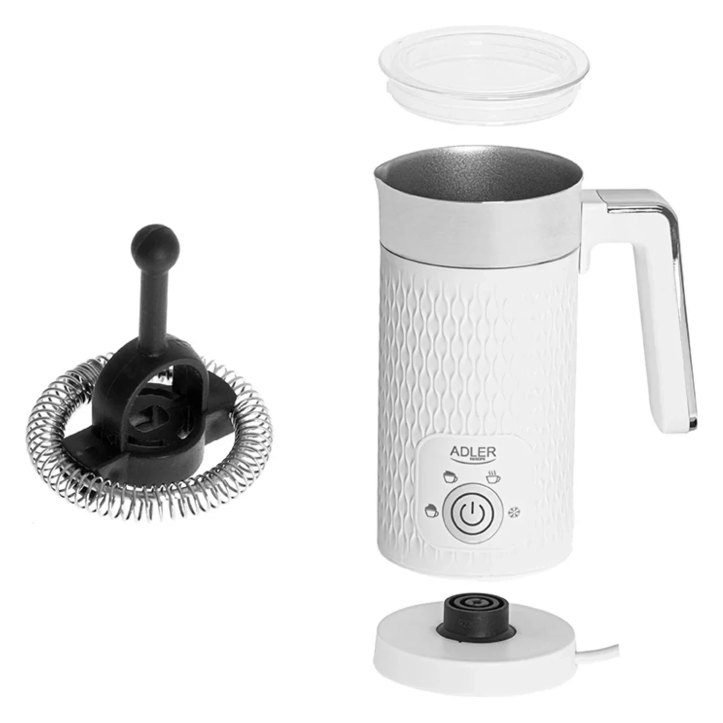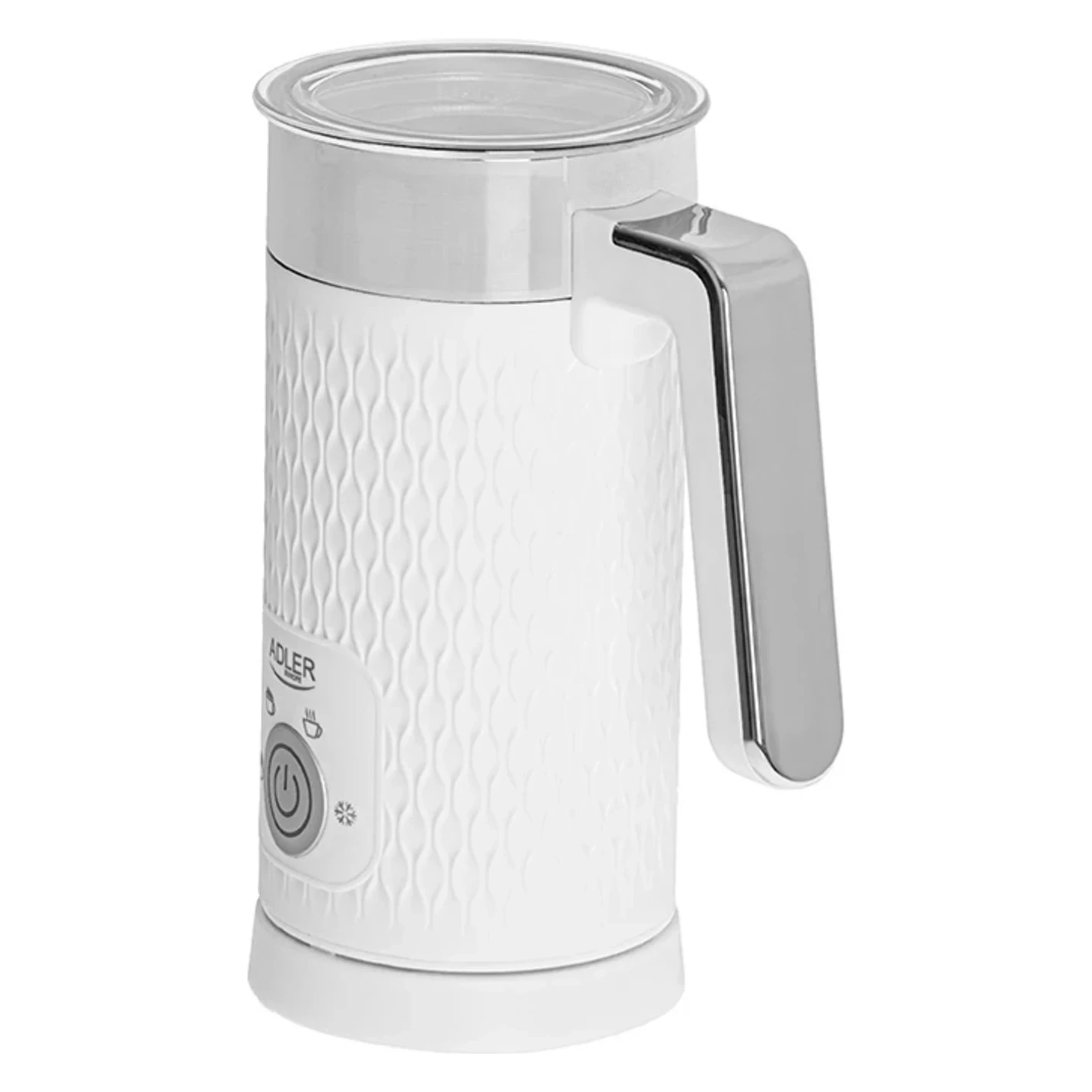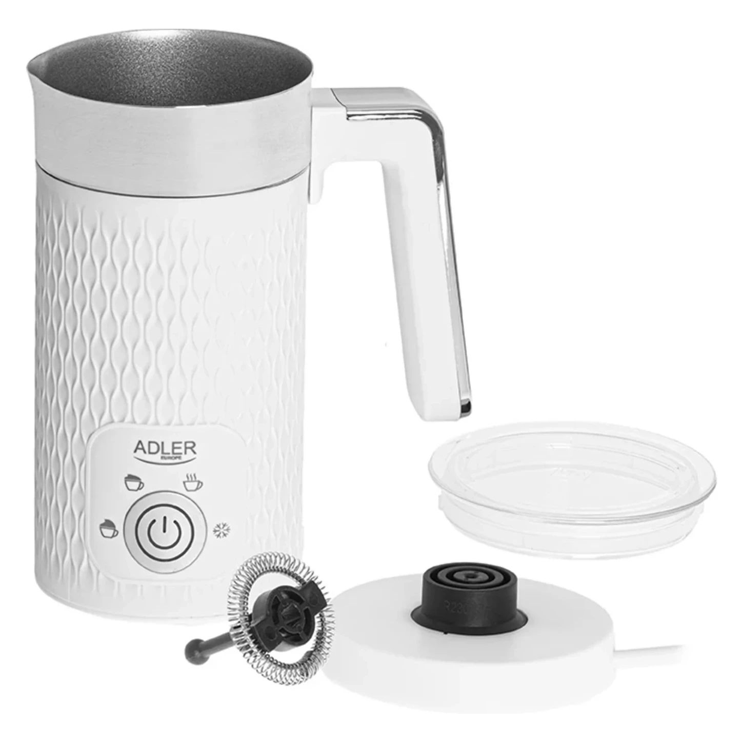 Napeňovač mlieka ADLER AD 4494 je zariadenie, ktoré vám umožní pripraviť si vlastnú penu do kávy ako z tej najlepšej kaviarne. Skvele sa bude hodiť na prípravu peny na cappuccino, latte, horúcu čokoládu a studené nápoje. Ak máte radi kávu naozaj horúcu, určite vás poteší, že prístroj mlieko sám ohrieva a zároveň ho napení, čím vytvorí krémovú penu. Prístroj má 4 funkcie: cappuccino, latte, ohrev, studená pena. Môžete pripraviť až 300 ml horúceho mlieka alebo až 130 ml mliečnej peny. Napeňovač mlieka AD 4494 sa veľmi ľahko používa a vďaka nepriľnavej povrchovej vrstve bude čistenie hrnčeka len pár okamihov. Priehľadné veko s tesnením chráni pred postriekaním a umožňuje priebežne kontrolovať proces penenia.