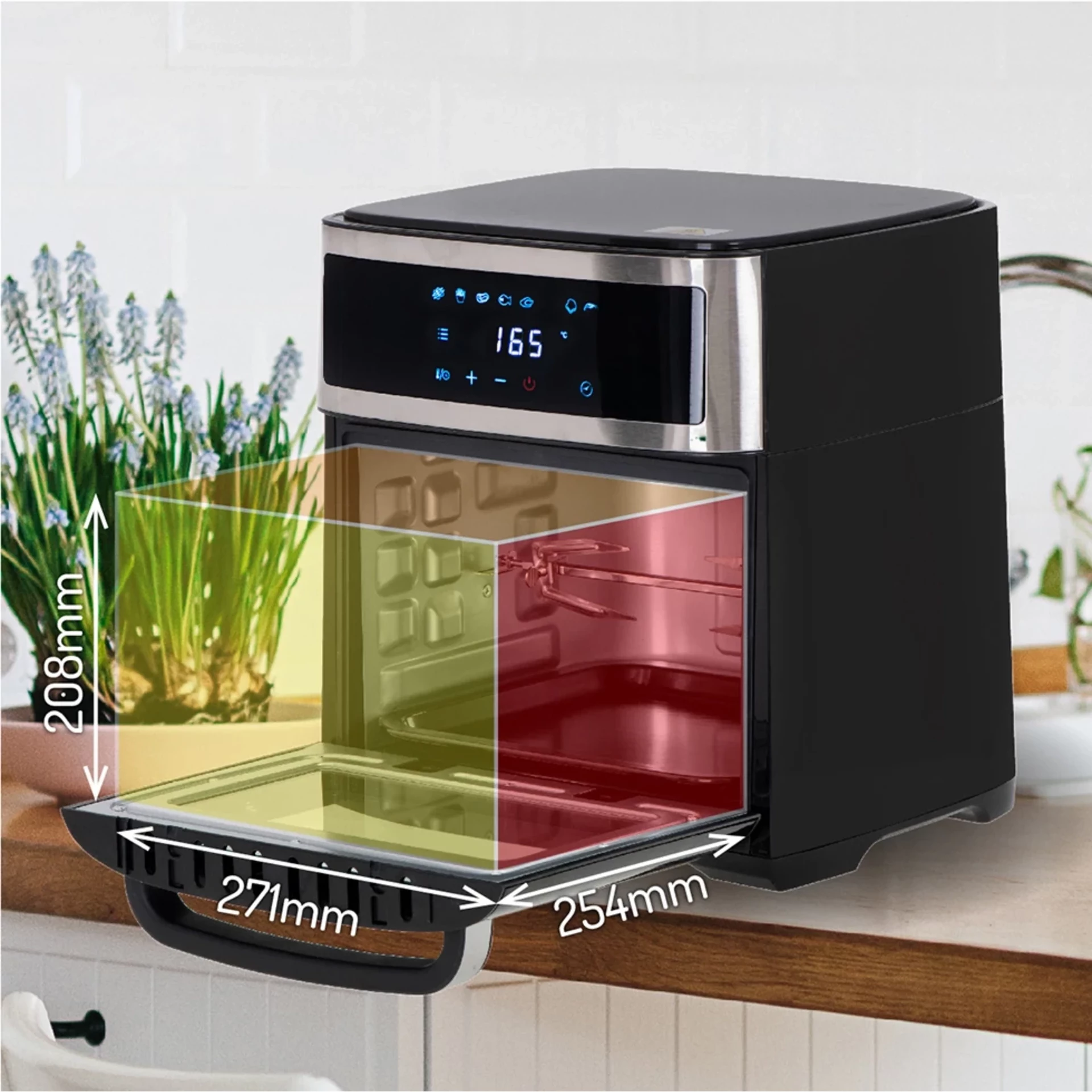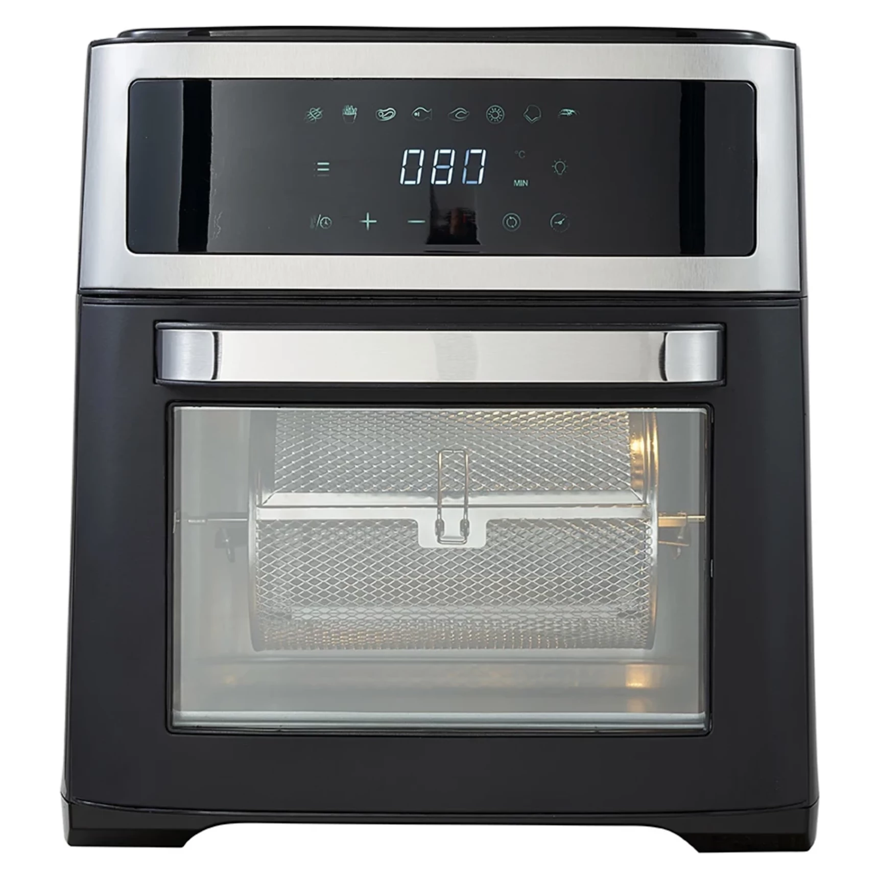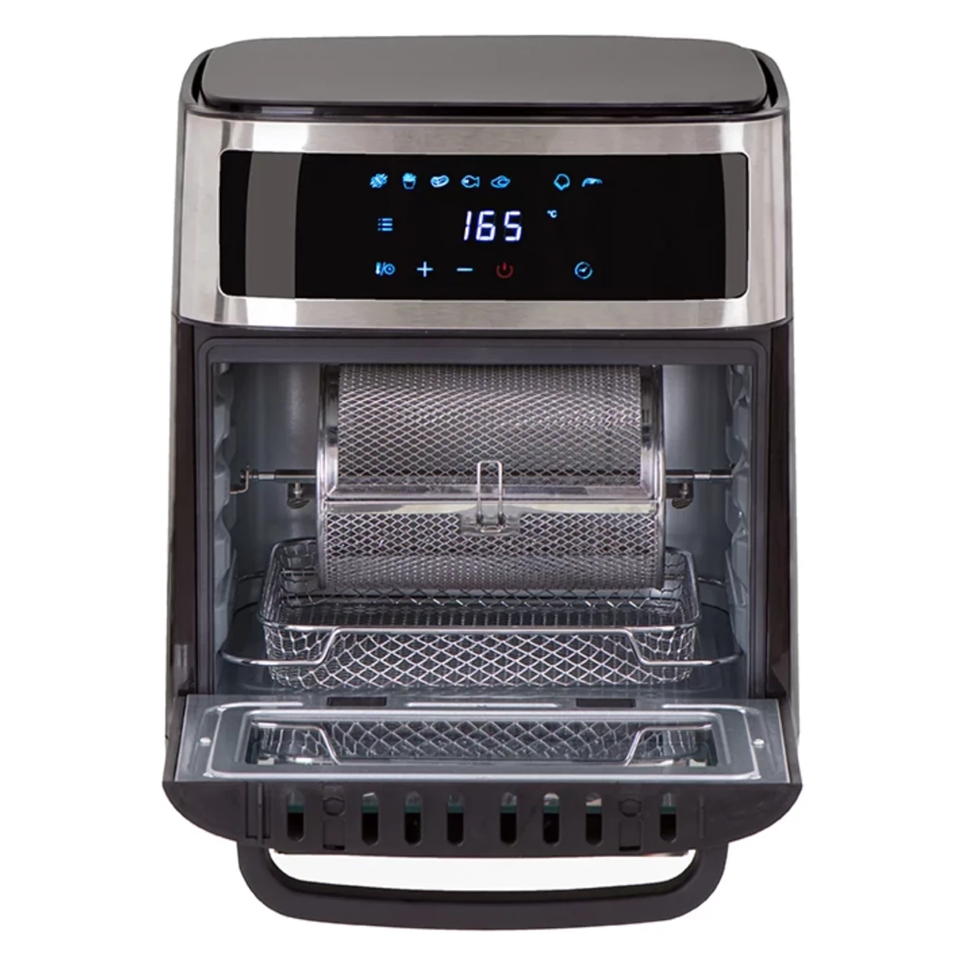 Rúra Airfryer využíva konvekčnú technológiu. Umožňuje piecť vybrané pokrmy bez potreby použitia oleja. Maximálny výkon rúry je 2500 W, čo vám pomôže pripraviť mäso tak, aby bolo prepečené, zvonku chrumkavé a stále dokonale šťavnaté. Naše zariadenie má teplotný rozsah od 40 do 200°C, vďaka čomu je možné pokrmy piecť, ale aj ohrievať či udržiavať teplé a podávať, keď sú všetky prvky hotové. Otočný košík na vyprážanie uľahčuje prípravu menších produktov: hranolky, krevety, zelenina. Objem rúry je až 13 litrov, takže môžete ihneď pripraviť jedlo pre celú rodinu alebo upiecť svoj obľúbený snack. Zariadenie má prehľadný biely LED displej a dotykový panel, ktorý uľahčuje výber preferovaného programu pečenia a meranie času. Možnosť odloženia štartu zariadenia od 1 do 720 minút uľahčuje plánovanie večere pre celú rodinu.