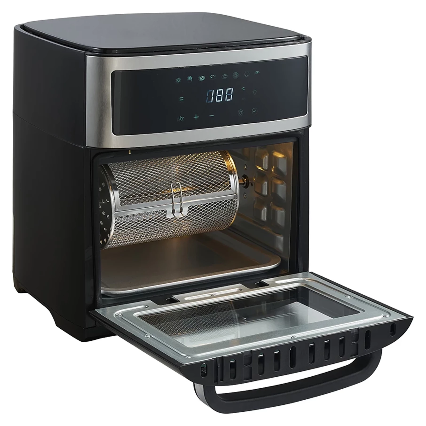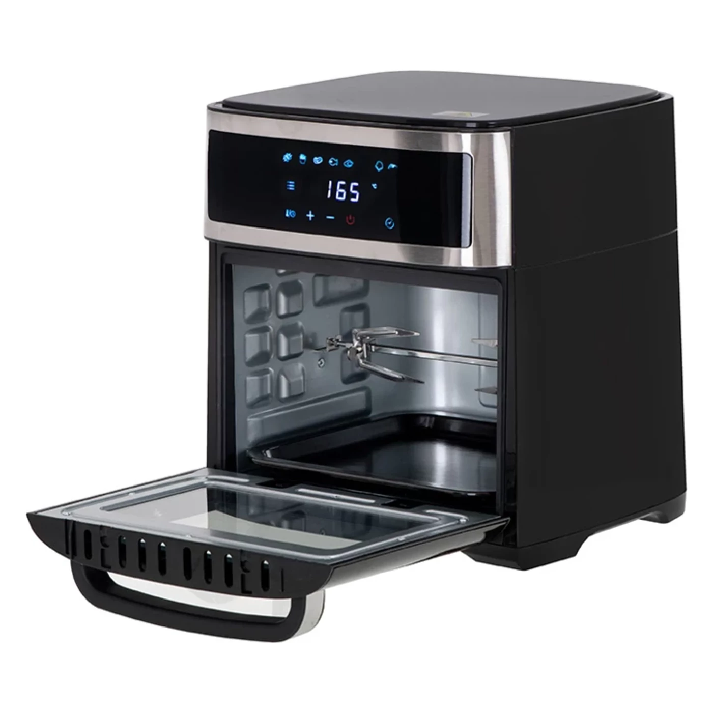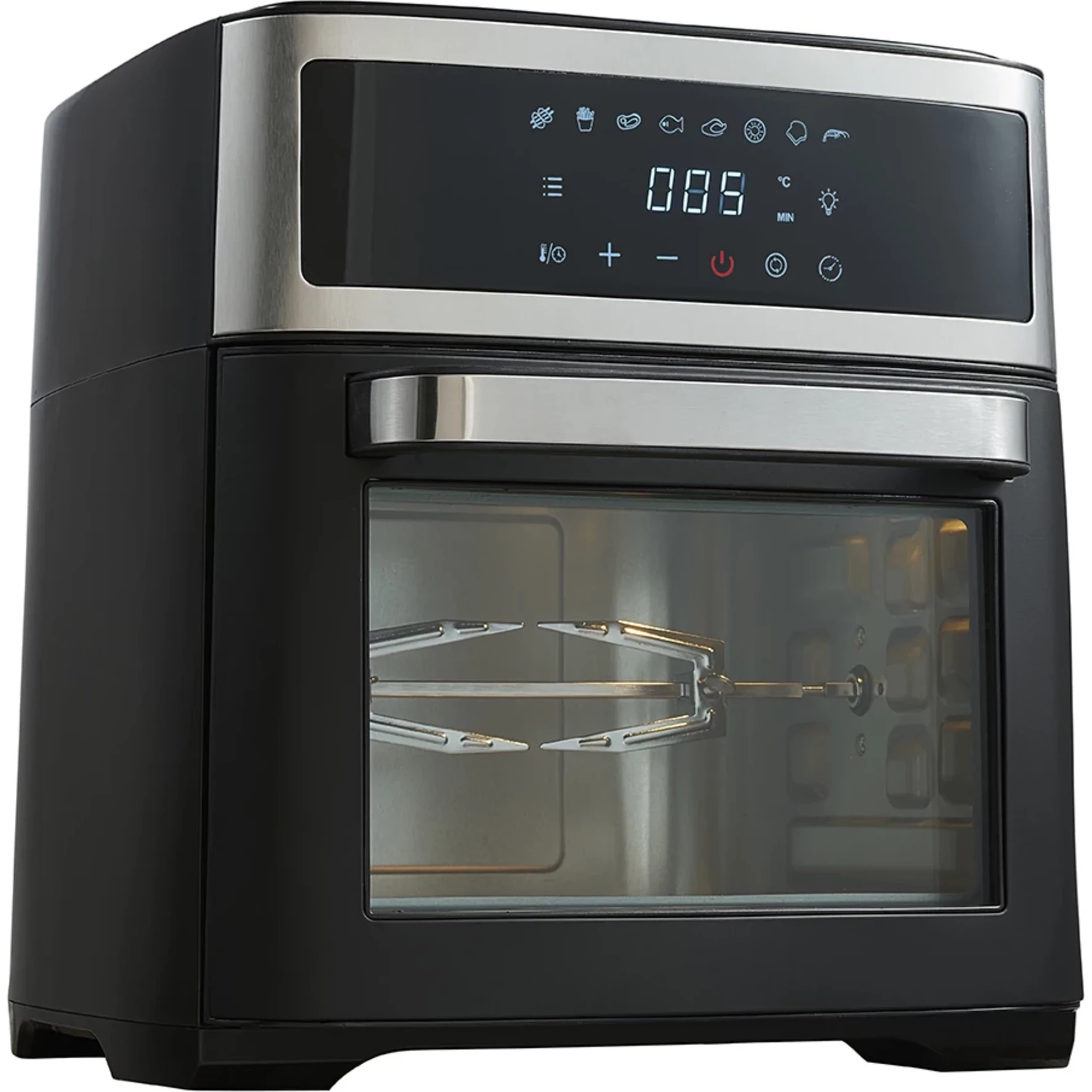 Rúra Airfryer využíva konvekčnú technológiu. Umožňuje piecť vybrané pokrmy bez potreby použitia oleja. Maximálny výkon rúry je 2500 W, čo vám pomôže pripraviť mäso tak, aby bolo prepečené, zvonku chrumkavé a stále dokonale šťavnaté. Naše zariadenie má teplotný rozsah od 40 do 200°C, vďaka čomu je možné pokrmy piecť, ale aj ohrievať či udržiavať teplé a podávať, keď sú všetky prvky hotové. Otočný košík na vyprážanie uľahčuje prípravu menších produktov: hranolky, krevety, zelenina. Objem rúry je až 13 litrov, takže môžete ihneď pripraviť jedlo pre celú rodinu alebo upiecť svoj obľúbený snack. Zariadenie má prehľadný biely LED displej a dotykový panel, ktorý uľahčuje výber preferovaného programu pečenia a meranie času. Možnosť odloženia štartu zariadenia od 1 do 720 minút uľahčuje plánovanie večere pre celú rodinu.
