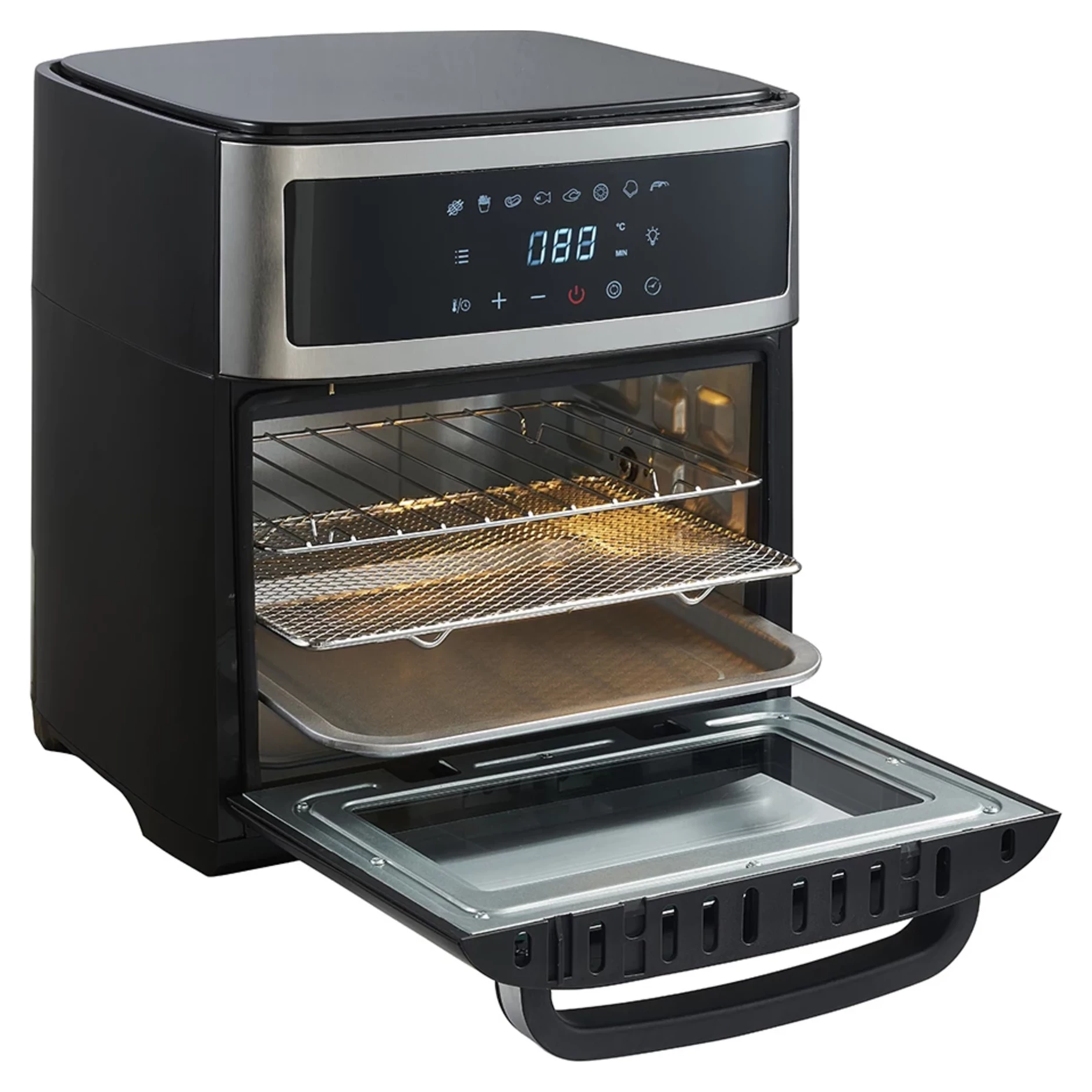 Rúra má osem programov, ktoré uľahčujú prípravu: kuracie krídelká, hranolky, steak/bravčové mäso, ryba, kuracie mäso, krevety a tiež pomôže sušiť potraviny ako zelenina alebo ovocie a upiecť chlieb. Vďaka toľkým možnostiam stačí výrobok pripraviť, vložiť do rúry a zvoliť program. Nemusíte sa zaoberať tým, aká teplota a čas bude najlepší. To je veľké pohodlie! Súprava obsahuje aj rúčku na plech na ľahké vyberanie, súpravu na rožteky, smaltovaný plech na pečenie, kôš vzduchovej fritézy, rolovací kôš a desať špízov na gril. Všetky prvky sú z odolných materiálov, ktoré vydržia roky a sú vhodné do umývačky riadu. Tento produkt je ideálny do malej kuchyne, kde nie je miesto na klasickú rúru, do niektorých študentských bytov, dovolenkových výletov alebo jednoducho pre fanúšikov zdravej výživy.