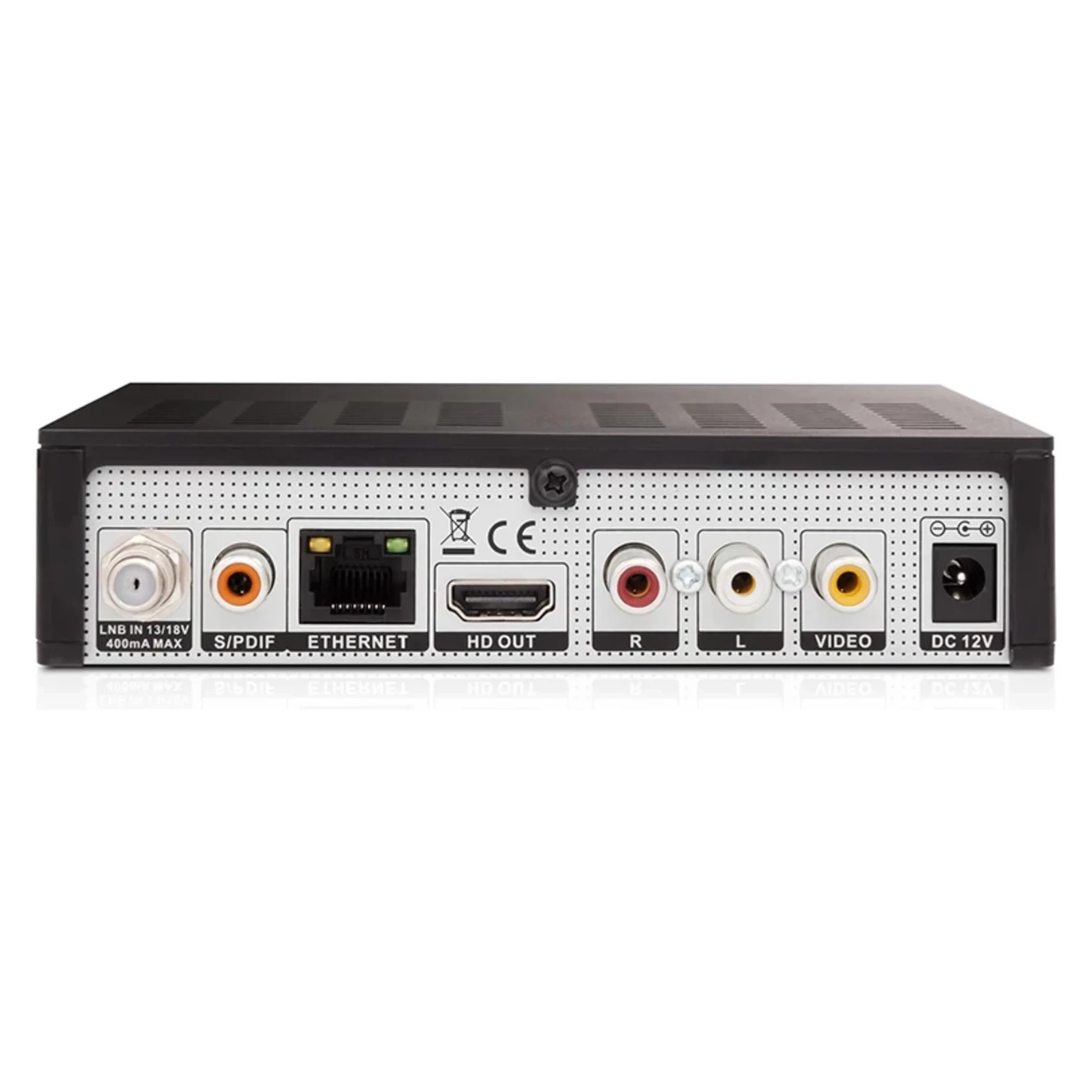 Zadný panel obsahuje konektor pre pripojenie koaxiálneho káblu od LNB konvertora, S/PDIF koax. káble pre digitálny výstup zvuku, ethernet konektor pre pripojenie prijímača na sieť LAN, HDMI výstup, cinch výstupy audio a video a na externý zdroj.