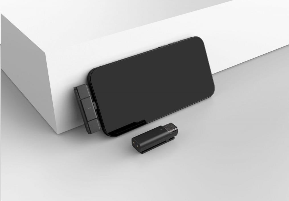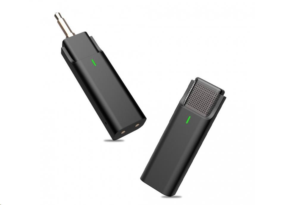 Bezdrôtový mikrofón s možnosťou pripevniť ho na odev vďaka klipu.