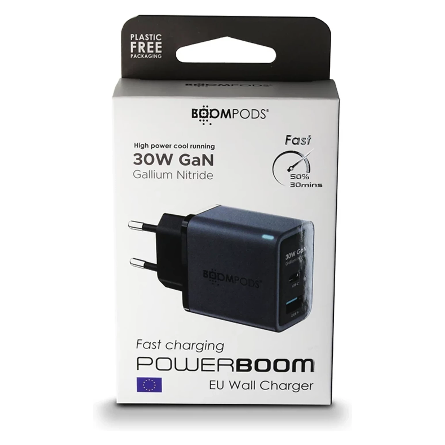 Rýchle nabíjanie pomocou sieťovej nabíjačky Boompods 30 W USB-C, ktorá poskytuje ultrarýchle nabíjanie zariadení s podporou USB-C PD. Rýchle nabite iPhone 8 alebo novší z 0 – 50 % za 30 minút alebo MacBook Air z 0 – 50 % len za 70 minút*.