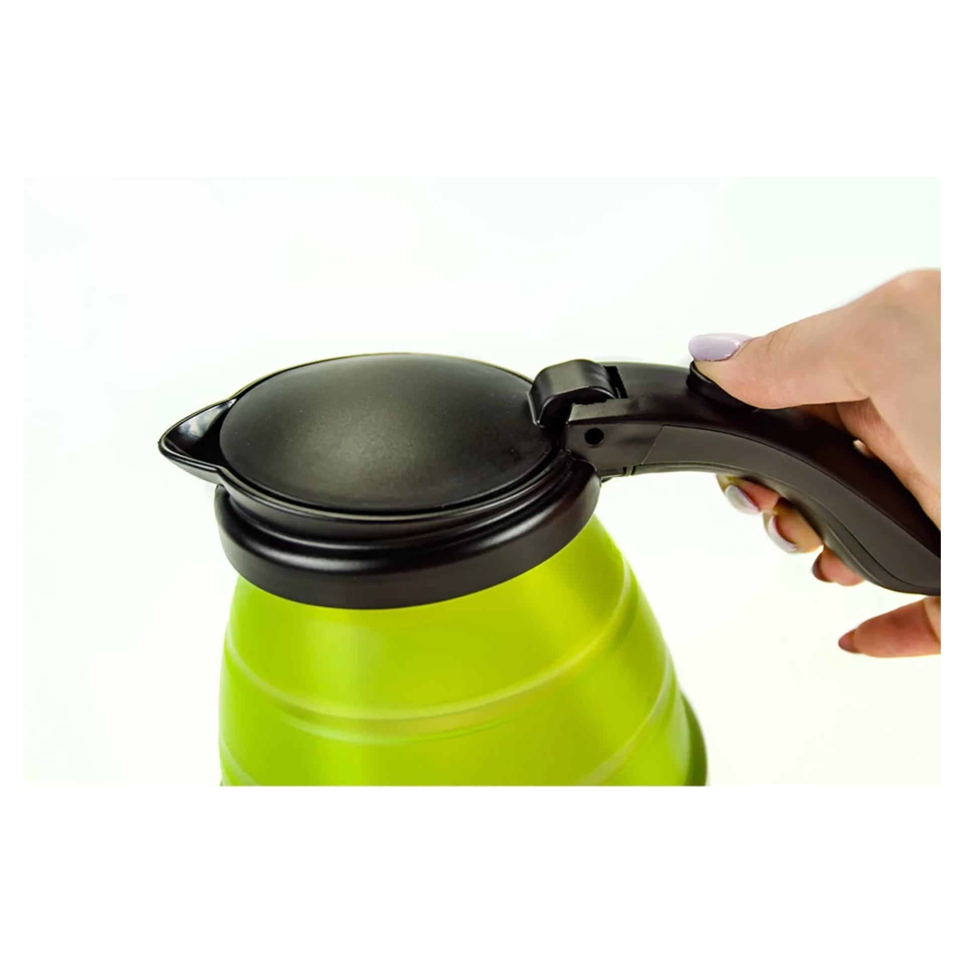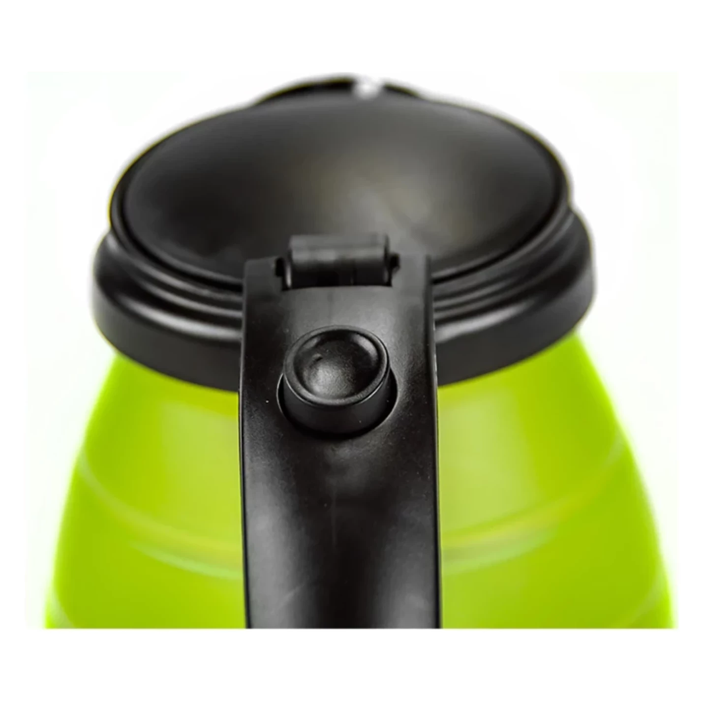 Výhodou turistickej kanvice popri malých rozmeroch je komfort a bezpečnosť používania. Jeho kapacita je až 0,5 litra, čo vám umožní mať dva poháre vody počas jedného použitia. Výrobok je vybavený automatickým vypnutím po prevarení vody a kontrolkou, aby sme ho mohli bezpečne používať za každých podmienok. Zelená časť krytu je vyrobená z pružného silikónu, zatiaľ čo držiak, rukoväť a veko sú vyrobené z vysoko kvalitného odolného voči teplotám čierneho matného plastu. Rukoväť je vybavená tlačidlom na otvorenie krytu, ktoré nás chráni pred nekontrolovaným rozliatím vody. Vo vnútri krytu pod vekom je otvor, cez ktorý sa para dostáva do bimetalového spínača. Toto riešenie vám pomôže vypnúť kanvicu hneď po prevarení vody. Blokáda zabraňujúca zapnutiu prázdneho zariadenia navyše zvyšuje bezpečnosť jeho používania a pomáha šetriť elektrickú energiu. Musíme sa postarať o odstránenie kameňa, ktorý sa zhromažďuje vo vnútri kanvice. Musíte používať špeciálne navrhnuté produkty a kanvica vám bude slúžiť dlhé roky a vezmete si ju na veľa dovolenkových ciest!