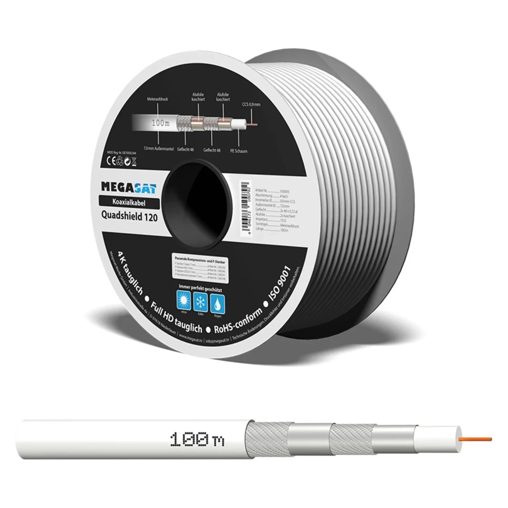 Koaxiálny kábel Megasat s dĺžkou 100m je vhodný pre prenos v 4K a fullHD kvalite. Vyhovuje smernici RoHS ISO 9001.