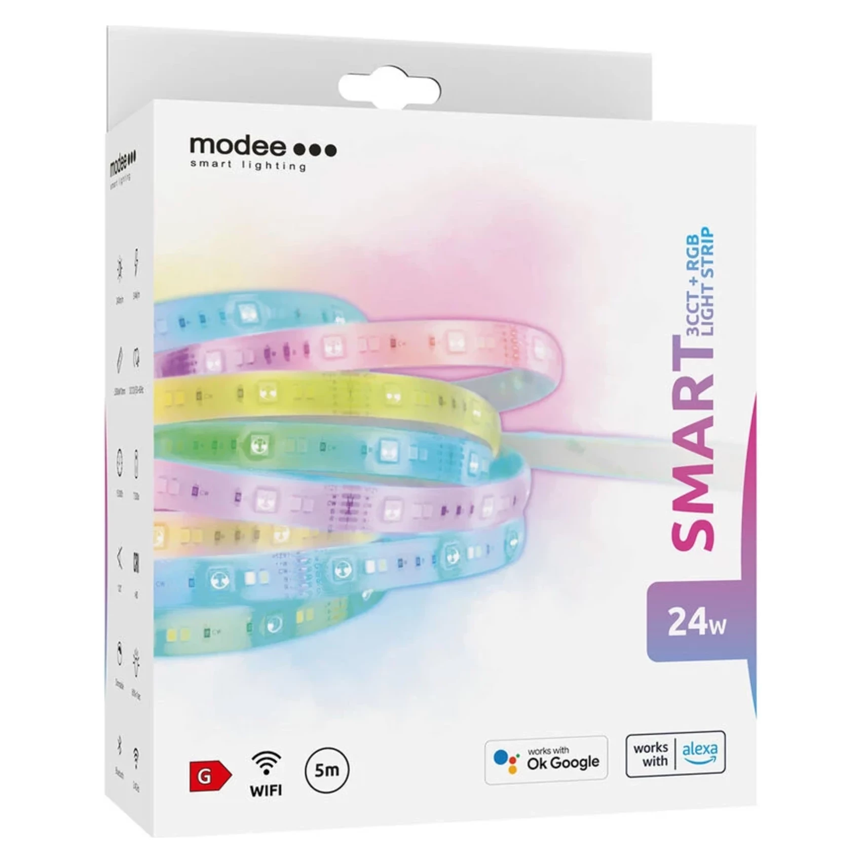 Tento 5 metrov dlhý LED pás má svetelný tok 240 lumenov na meter, čo znamená, že celý pásik dokáže osvetliť svetelným tokom až 1200 lumenov. Pri napätí 12 V to znamená spotrebu 3,4 W na meter, čo je 17 W na celú špirálku. Jeho životnosť je 15 000 hodín, takže si jeho útulné svetlo môžete užívať ešte dlho po jeho kúpe. Hodnota CRI je 80, čo naznačuje jeho vynikajúce vlastnosti pri podaní farieb. Inteligentný LED pásik Modee je možné pripojiť ku konektoru s 24W zdrojom.
