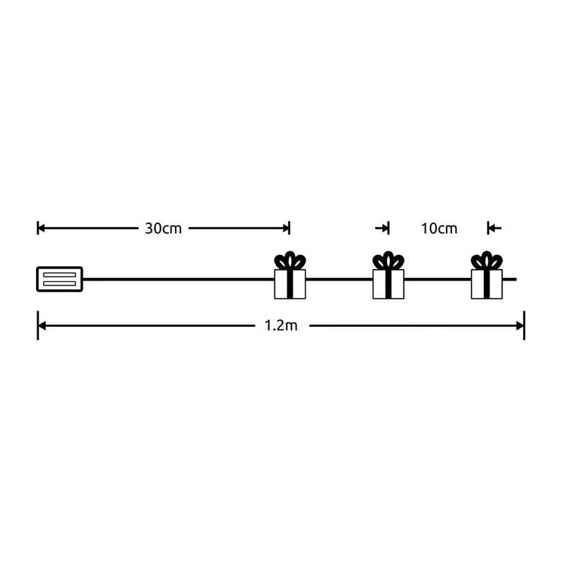 Rozmery sú 120 centimetrov dlhé a má nainštalovaných celkovo 10 LED čipov. Žiarovky v tvare darčekového balenia sú umiestnené každých 10 centimetrov. K girlande je 30-centimetrovým káblom pripojený zásobník na batérie, v ktorom môžeme použiť svetelný reťazec umiestnením 2 ceruzkových batérií (AA). Ak do zariadenia vložíme kvalitnú a odolnú verziu batérie tejto veľkosti, vydrží pri nepretržitom používaní až 3 dni.