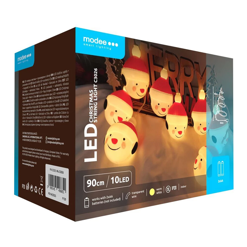 Rozmery sú 120 centimetrov dlhé a má celkovo 10 LED čipov. Žiarovky v tvare Santa Clausa sú umiestnené každých 10 centimetrov. K girlande je 30-centimetrovým káblom pripojený zásobník na batérie, v ktorom môžeme použiť svetelný reťazec umiestnením 2 ceruzkových batérií (AA). Ak do zariadenia vložíme kvalitnú a odolnú verziu batérie tejto veľkosti, vydrží pri nepretržitom používaní až 3 dni.