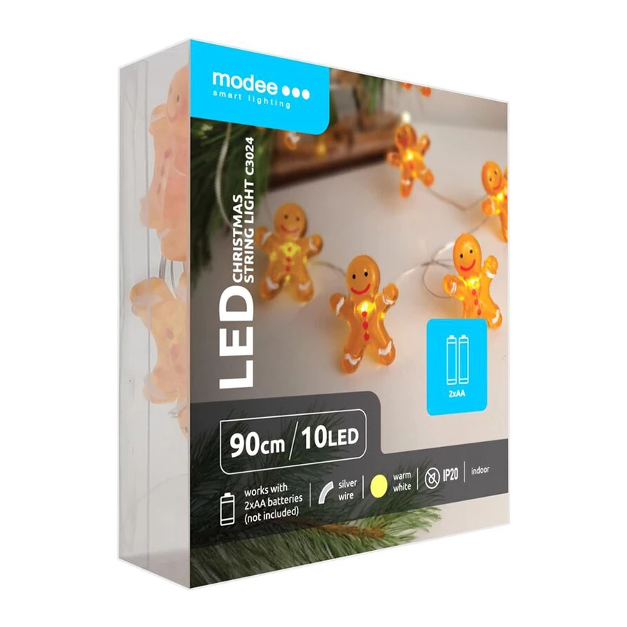 Rozmermi je dlhý 120 centimetrov a má nainštalovaných celkovo 10 LED čipov. Žiarovky v tvare perníka sú umiestnené každých 10 centimetrov. K reťazi je 30-centimetrovým káblom pripojený zásobník na batérie, v ktorom môžeme svetelný reťazec používať vložením 2 ceruzkových batérií (AA). Ak do zariadenia vložíme kvalitnú a odolnú verziu batérie tejto veľkosti, vydrží pri nepretržitom používaní až 3 dni.