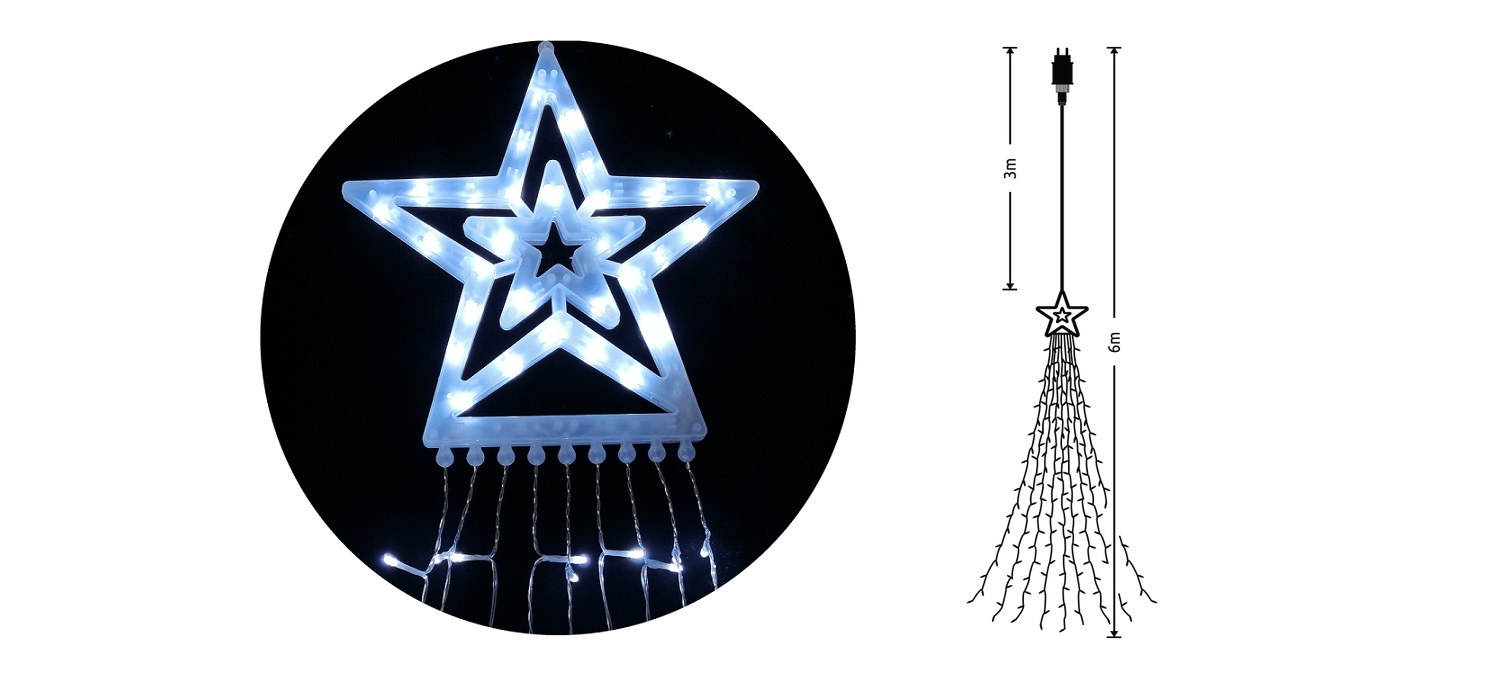 Rozmerovo je dlhý 6 metrov, táto dĺžka je polovičná, z veľkej hviezdy, ktorá aj svieti, visia 3 metre dlhé káble, na ktorých je osadených celkom 300 LED čipov. Veľmi jednoducho sa inštaluje. Z hľadiska pripojenia je možné ho pripojiť k sieti pomocou zástrčky štandardu EÚ.