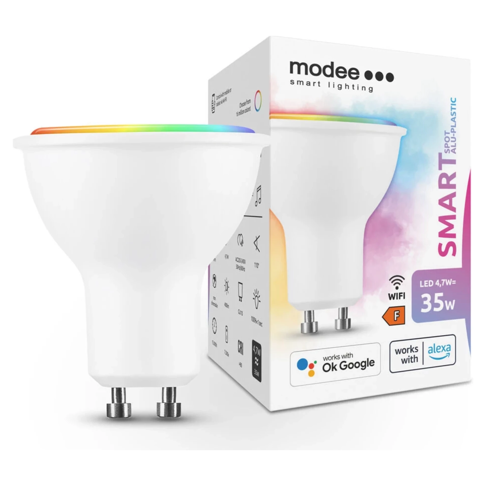 Inteligentná LED žiarovka v tvare spot Modee LED Smart Tuya Wi-Fi Spot GU10 4,7W 110 ° s možnosťou nastaviť farebnú teplotu svetla v širokom rozsahu (2700K-6000K) podľa vykonávanej aktivity. Možno si nastaviť nielen farebnú teplotu ale tiež, ako majú žiarovky vyzerať. Zo 16 miliónov farieb si možno vybrať tú, ktorá Vám najviac vyhovuje.