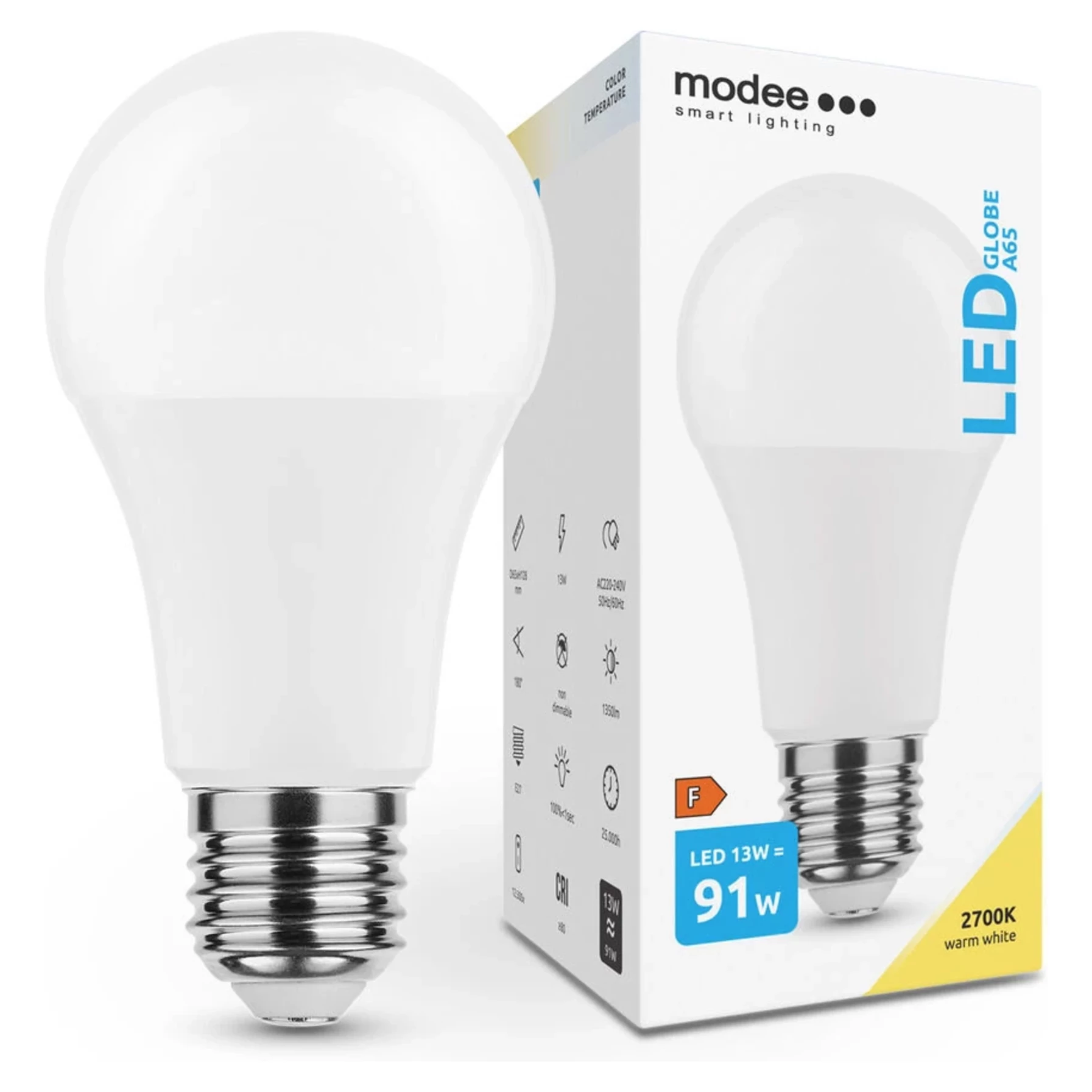 Modee Lighting LED žiarovka so závitom E27 a výkonom 13W. Farba svetla je teplá biela a vďaka 270° osvieti celú miestnosť.