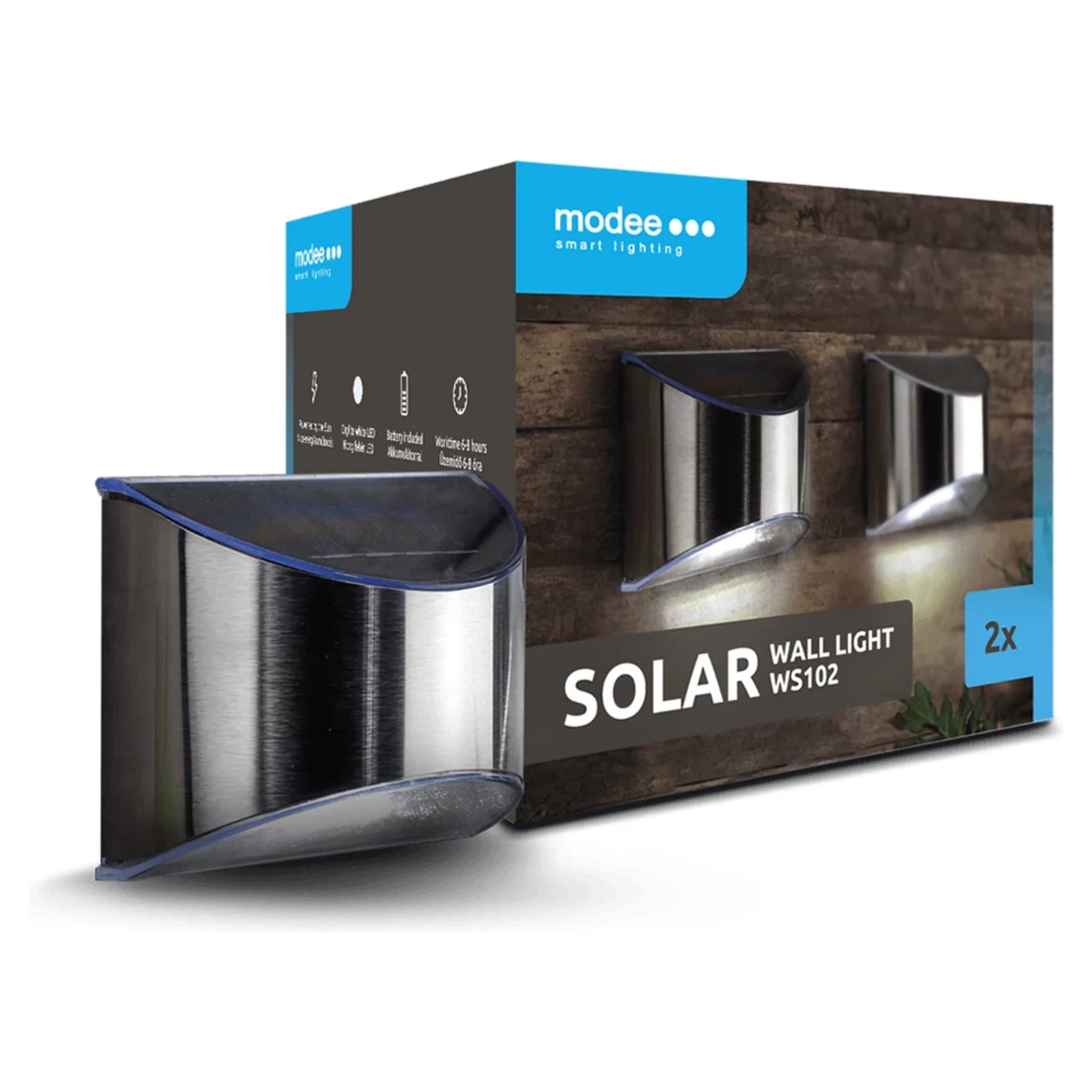 Modee 102 je malé nástenné solárne svietidlo moderného štýlu vyrobené z kvalitnej nehrdzavejúcej ocele, ktoré možno namontovať na plot alebo stenu. Každé svietidlo pracuje s polykryštalickým solárnym panelom, ktorý sa cez deň nabíja slnečným žiarením, čo umožňuje svetelnému zdroju SMD LED svietidla svietiť svetelným tokom 5 lúmenov až 8 hodín v noci. Ich farebná teplota je 6000 K, čo znamená, že vyžarujú studené biele svetlo.