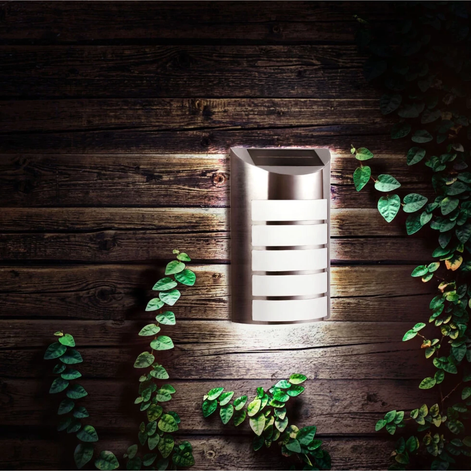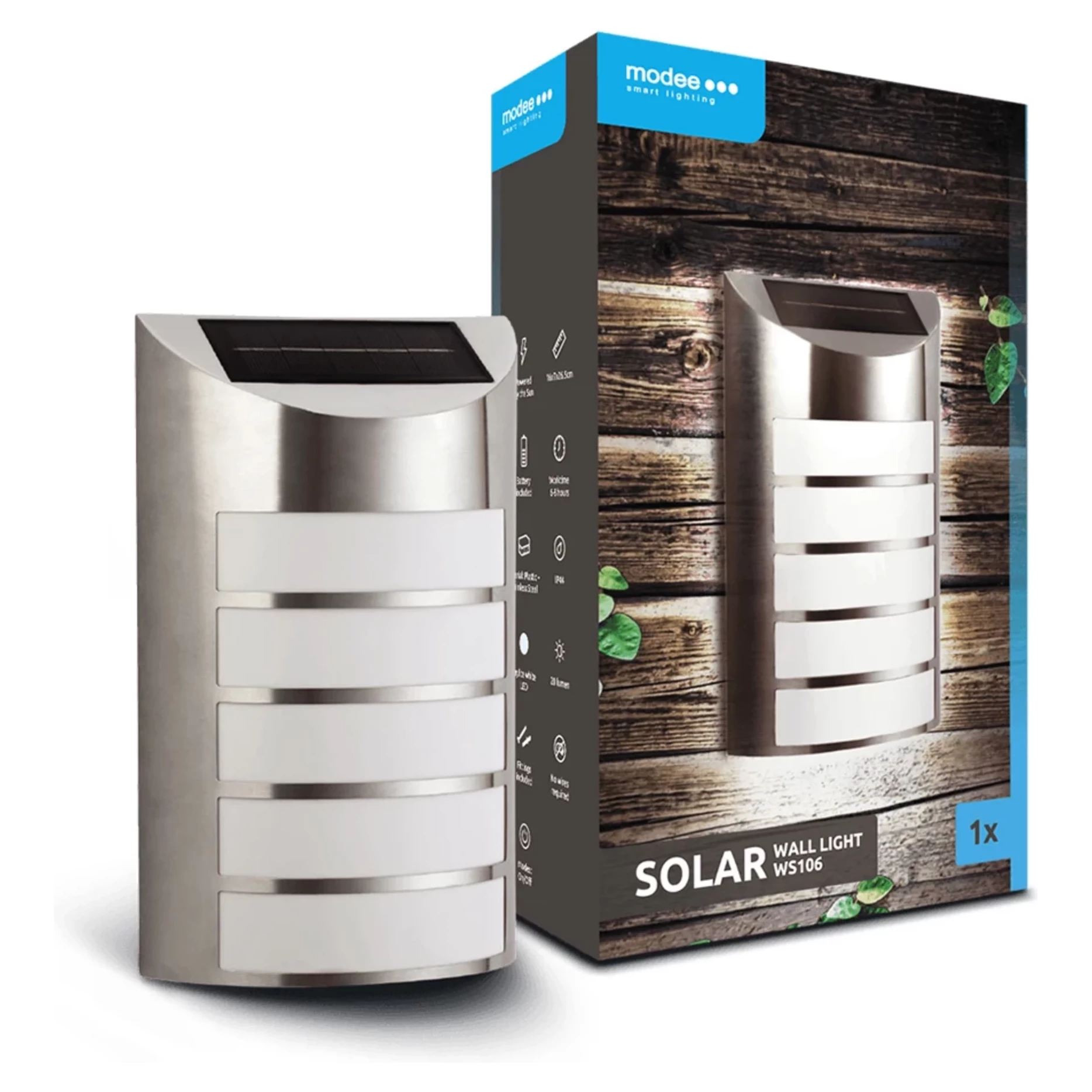 Modee 106 je moderné nástenné solárne svietidlo vyrobené z nehrdzavejúcej ocele. Pracuje s jedným polykryštalickým solárnym panelom, ktorý sa cez deň pod vplyvom slnečného žiarenia nabíja, takže SMD LED v ňom dokáže svietiť až 8 hodín v noci so svetelným tokom 20 lúmenov. Toto jemné svetlo nám môže pomôcť zorientovať sa v dome. Jeho farebná teplota je 6000 K, čo znamená, že vyžaruje studené svetlo.