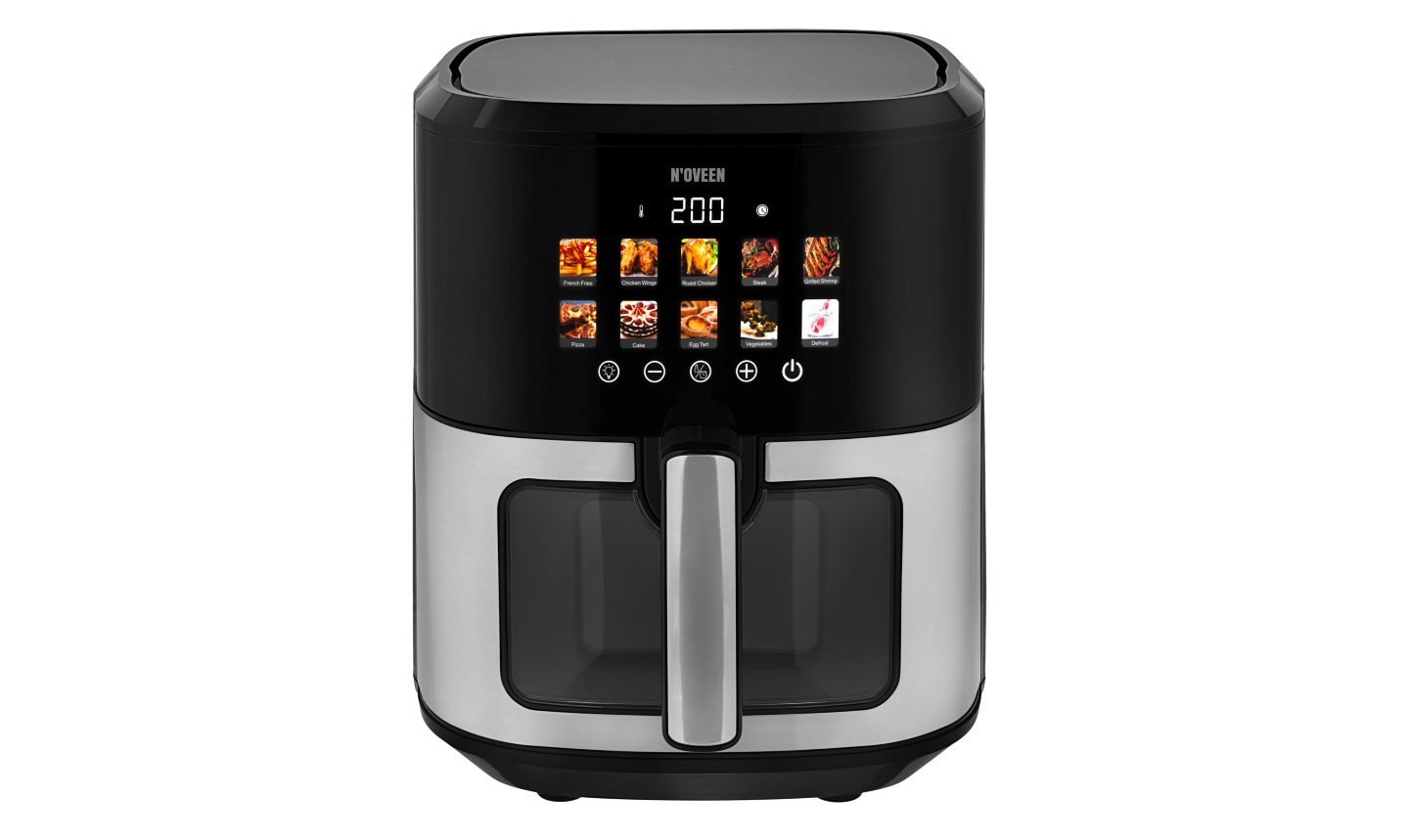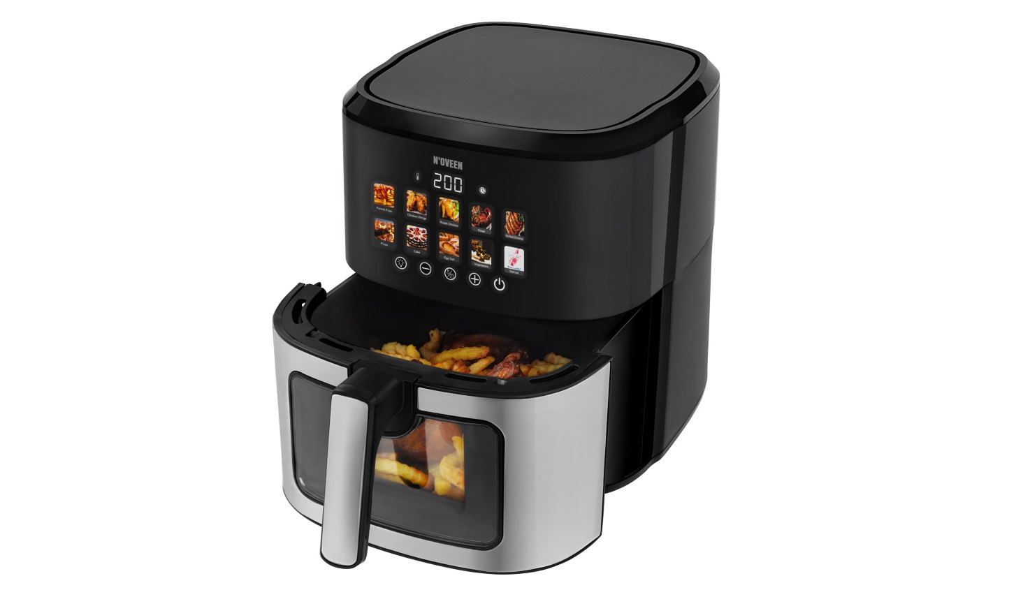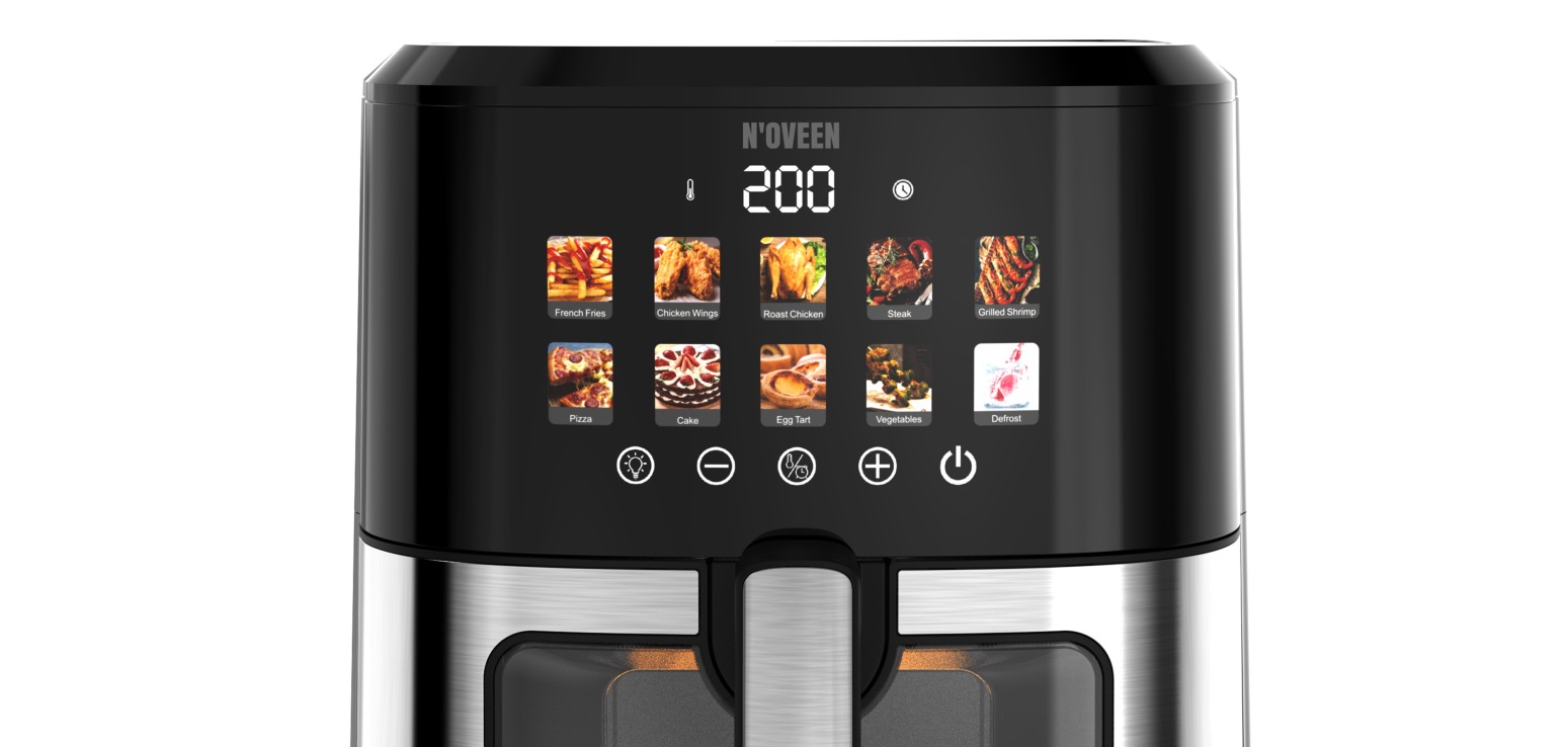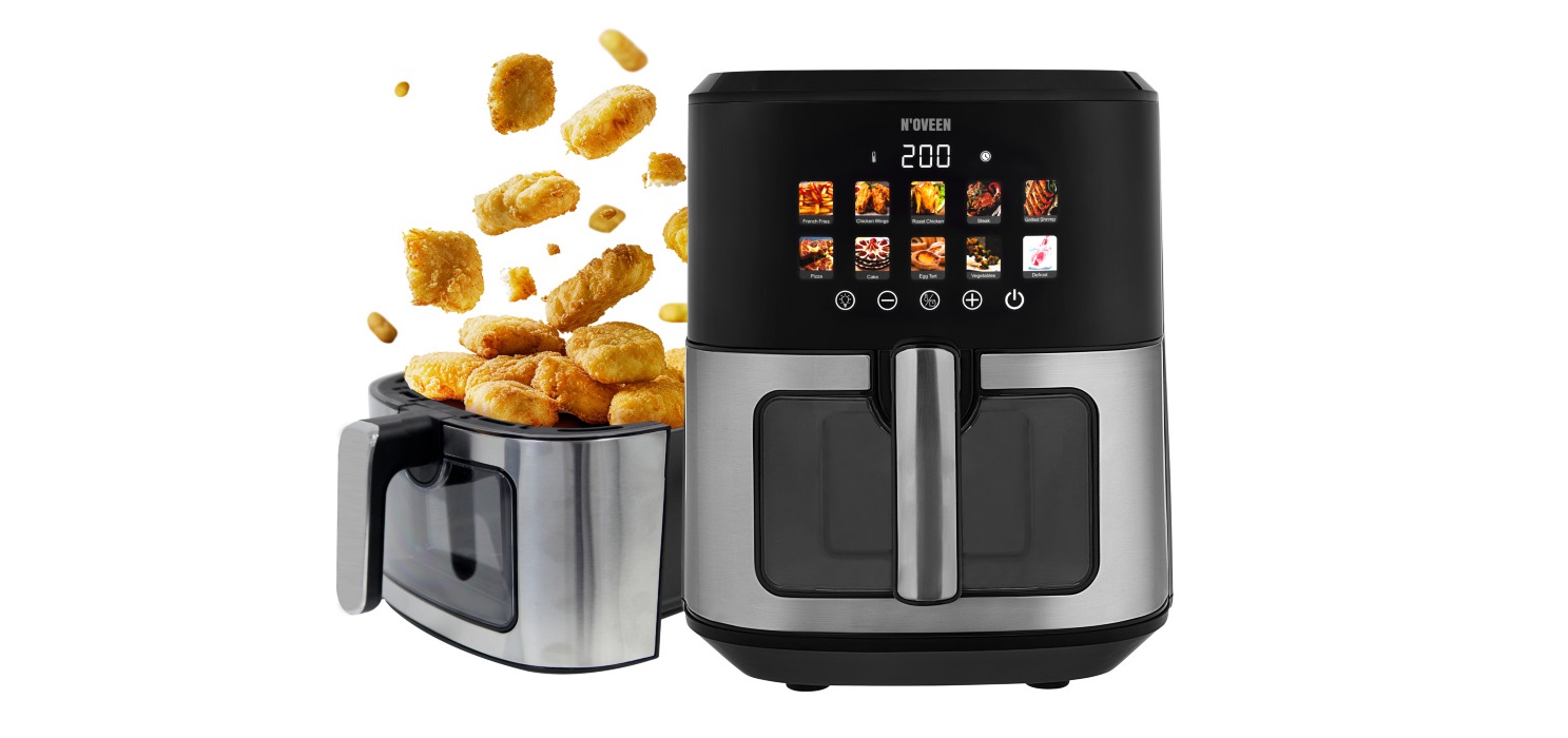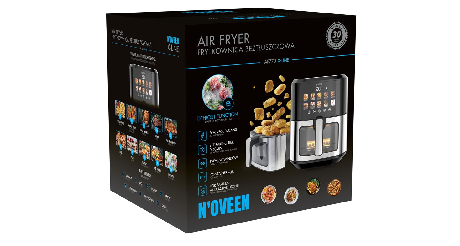 S fritézou bez tuku NOVEEN AF770 X-LINE s farebným dotykovým panelom posuniete svoje zážitky z varenia na novú úroveň. Tento spotrebič navrhnutý s ohľadom na zdravý životný štýl vám umožní pripraviť chutné a chrumkavé jedlo s minimálnym množstvom tuku.