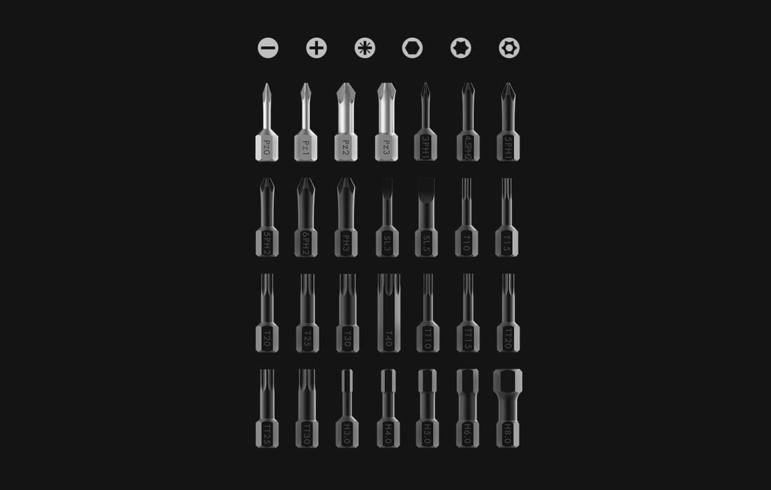 V sade nájdete 28 funkčných bitov, 9 šesťhranných klúčov, adaptér, račňový kľúč, nadstavec a rukoväť, ktorá pasuje na všetky diely. Vďaka tomu je náradie ideálne na výmenu bicyklových kolies, demontáž rôznych dielov, servisné opravy alebo kutilov. Spravujte konfiguráciu skrutkovača voľne a magnetická objímka zaistí pevné usadenie hrotu a poskytne stabilitu celej konštrukcii.