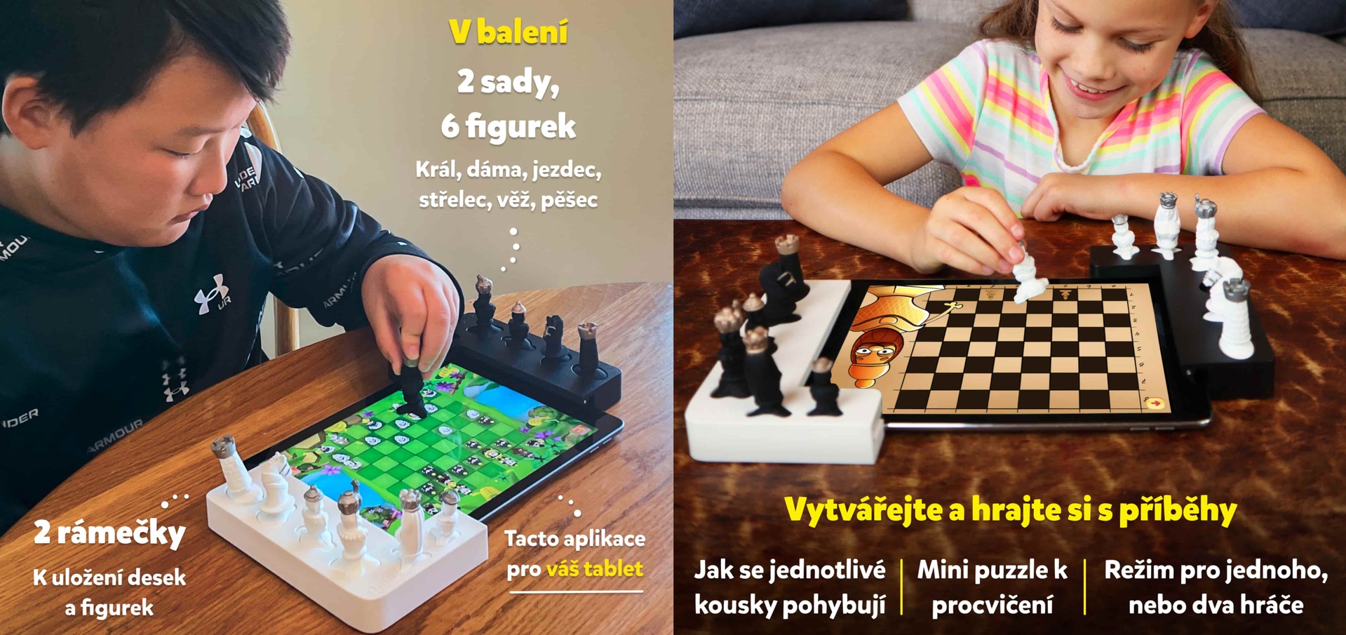 Ku kompatibilnému tabletu pripojte dva protišmykové rámčeky s figúrkami. Stiahnite a otvorte si aplikáciu Tacto. Vybrať si môžete medzi režimom učenia, hrou pre jedného hráča, hrou pre dvoch hráčov a skladačkou 4x4. Stačí potvrdiť výber kliknutím a začať hrať. Svoje pohyby na obrazovke tabletu vykonávate pomocou fyzických figúrok. Každá figúrka má svoj vlastný špecifický footprint, nemôžete preto ťahať dámou, keď v držíte v ruke pešiaka. Deti sa tak ľahko a hravo naučia rozoznávať jednotlivé figúrky a možnosti ich ťahov.