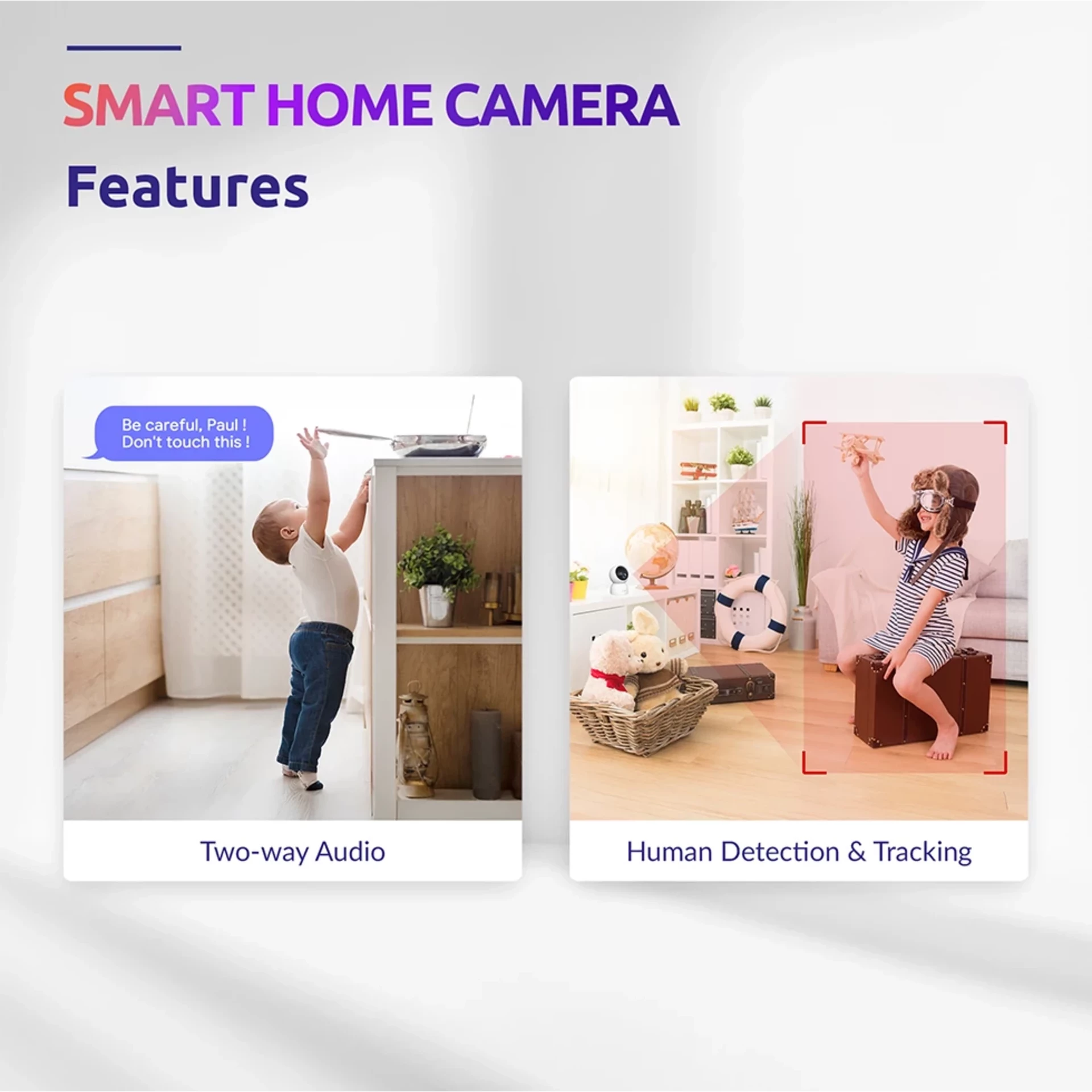 Predstavujeme naše bezpečnostné riešenie pre obytné budovy, Smart Home Kamru. Je navrhnutá tak, aby zabezpečila bezpečnosť vášho domova alebo firmy, a môže sa pochváliť pôsobivým radom finkcií, ktoré zabezpečia komplexný dohľad a bezproblémovú kontrolu. Jej 360° možnosť otočenie zabezpečí kompletné pokrytie, zatiaľ čo inteligentná detekcia pohybu a ľudí odfiltruje falošné poplachy. Vďaka IR nočnému videniu budete mať dokonalý prehľad aj počas nočných hodín. Pomocou aplikácie a dvojcestnému zvuku môžete zabezpečiť obojsmernú komunikáciu.