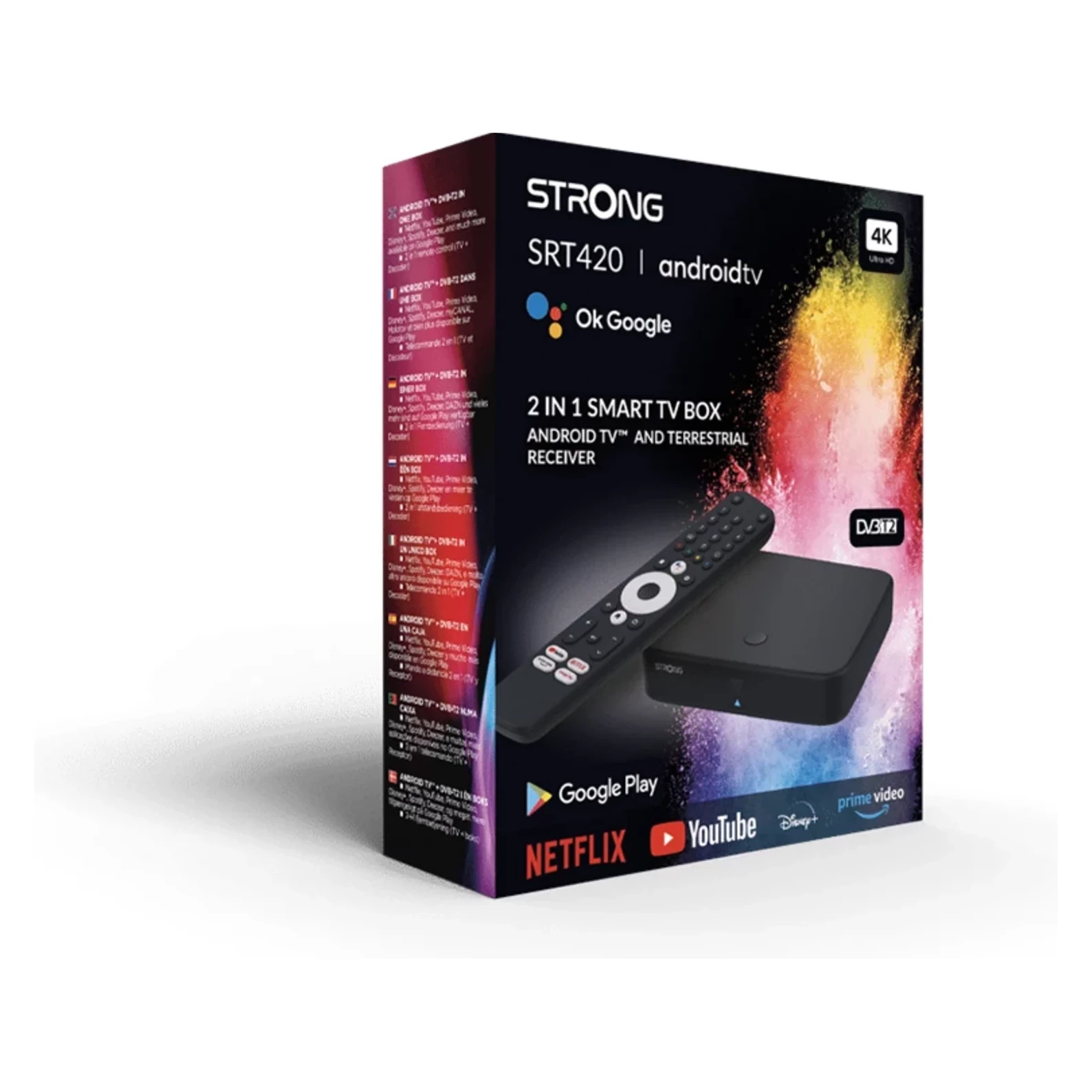 Tento malý a kompaktný inteligentný box Google TV je tou správnou voľbou pre váš televízny prijímač. Pripojte zariadenie STRONG SRT420 od spoločnosti STRONG a zmeňte svoj TV na inteligentný televízny prijímač s priamym prístupom k obchodu Google Play Store! STRONG SRT420 je možné použiť aj ako DVB-T2 prijímač s podporou kodeku H.265/HEVC