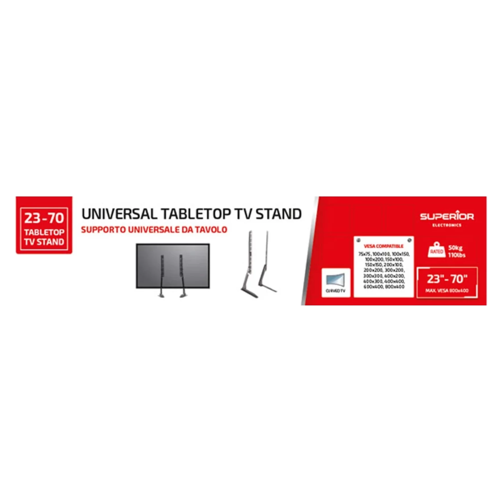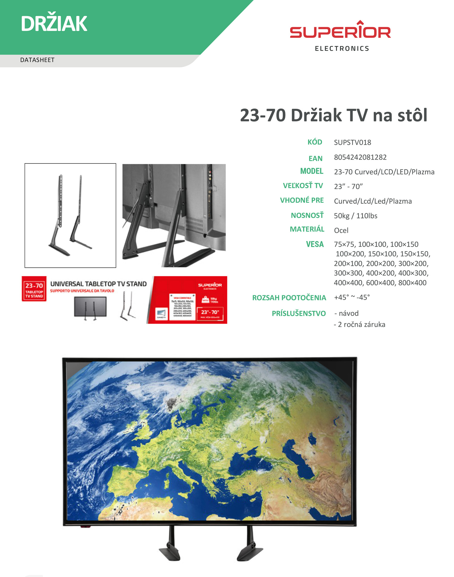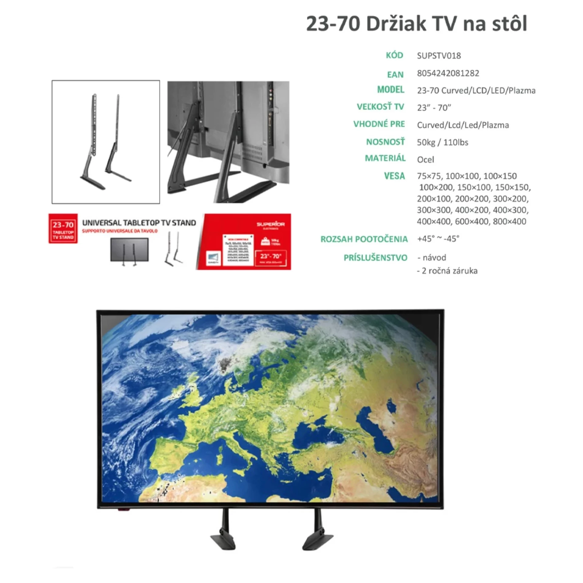 Pevný kovový držiak určený na stôl. Vďaka tomuto držiaku môžete na Váš stôl alebo skrinku umiestnit TV s uhlopriečkou od 23″ – 70″ (58cm – 177cm). Vďaka vysokej nosnosti je vhodný skoro pre všetky druhy TV. Vyhotovenie je kov v čiernej farbe.