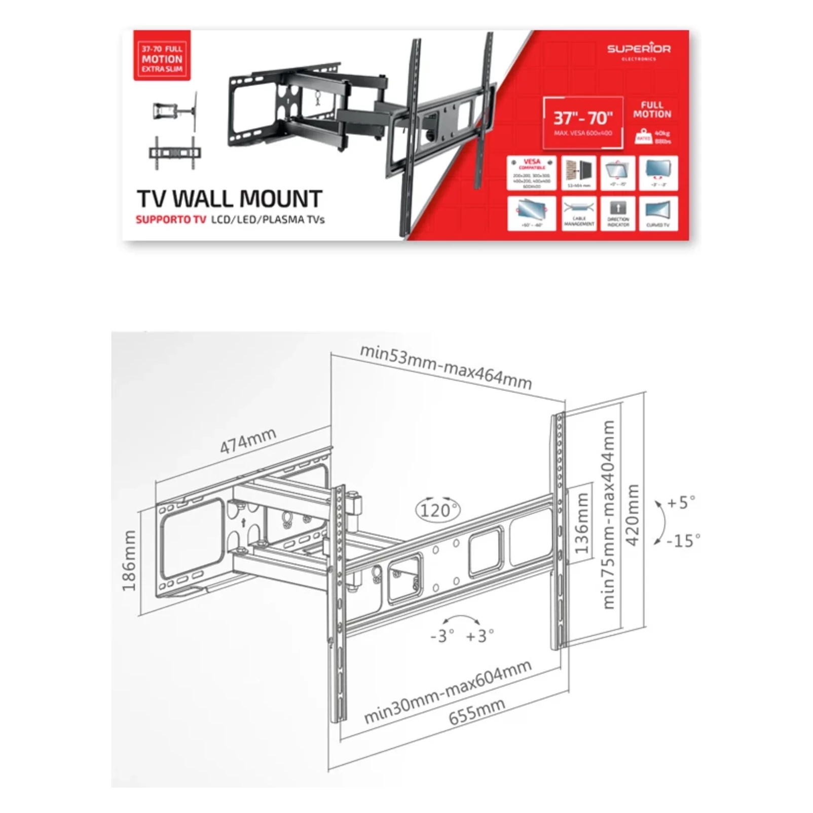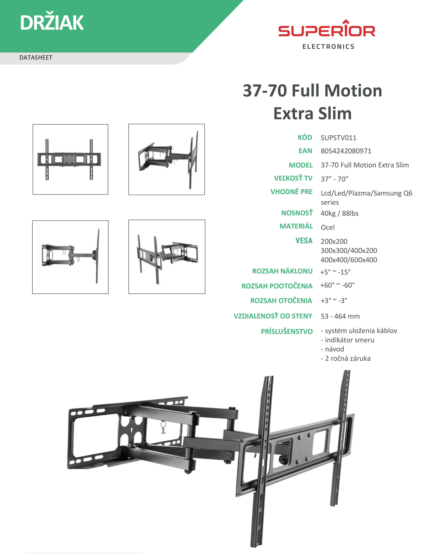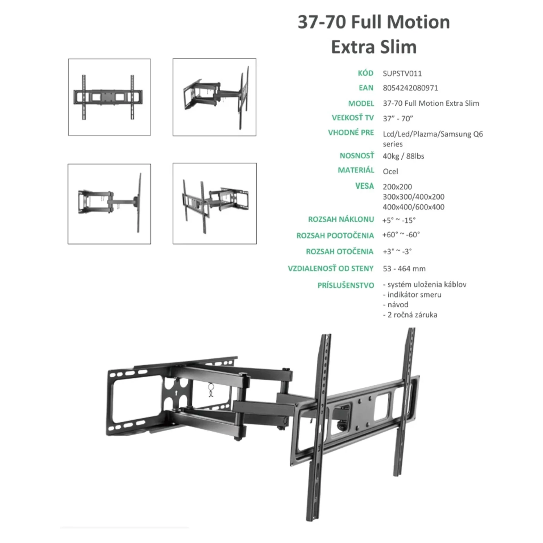 Extra tenký držiak na stenu pre TV s uhlopriečkou 37″ – 80″ (93 cm – 177 cm).. Možnosť uchytenia TV pomocou štandardu VESA 200×200, 300×300, 400×200, 400×400, 600×400. Držiak je plne pohyblivý do strán až +-60° a aj s možnosťou náklonu. Vyhotovenie je kovové v čiernej farbe.