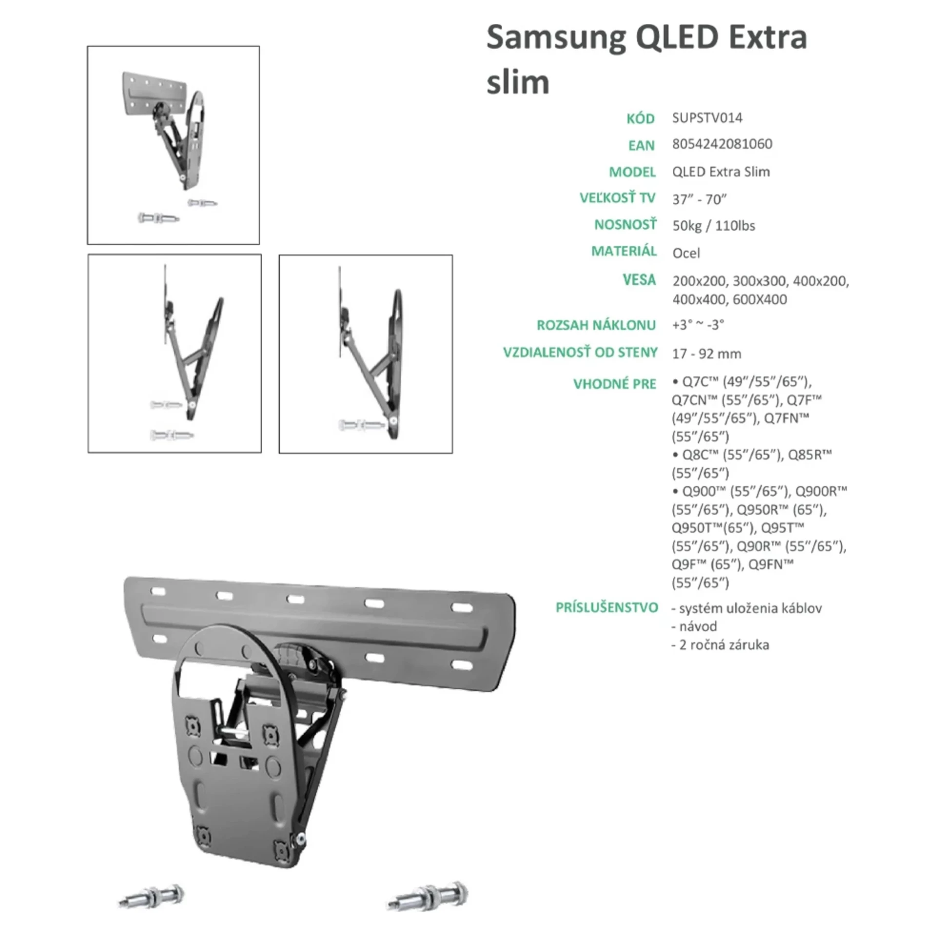 Držiak pre QLED TV značky Samsung. Tneto držiak je určený pre modely s uhlopriečkou od 49-65\” (124 cm – 165 cm). Vďaka tomuto držiaku je možné Vašu TV nakloniť až o 3°.