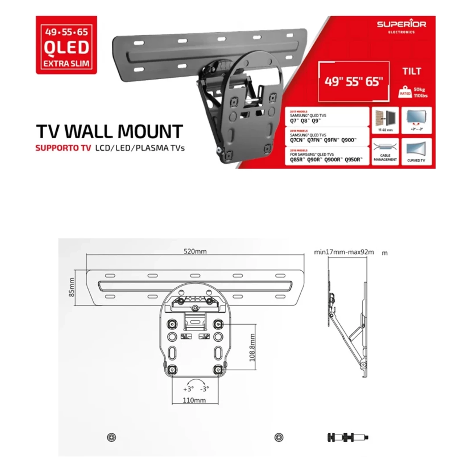 Držiak pre QLED TV značky Samsung. Tneto držiak je určený pre modely s uhlopriečkou od 49-65″ (124 cm – 165 cm). Vďaka tomuto držiaku je možné Vašu TV nakloniť až o 3°.