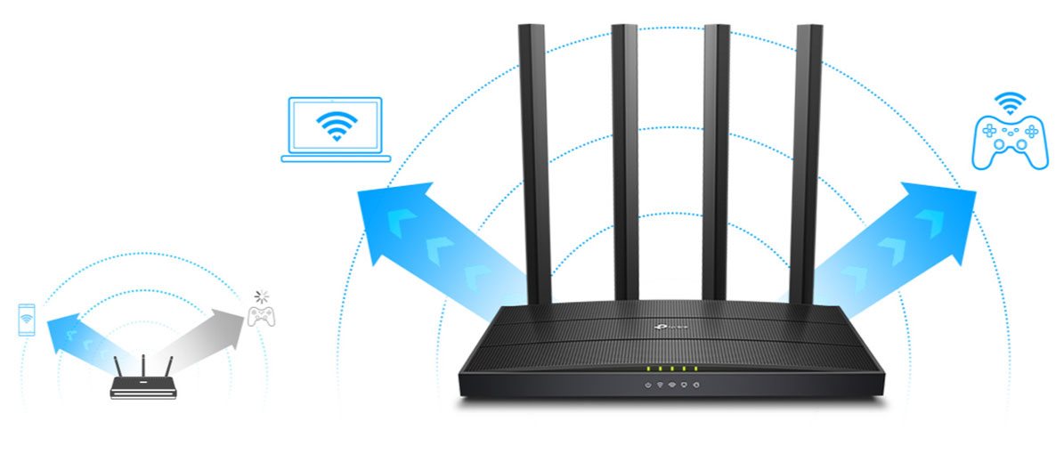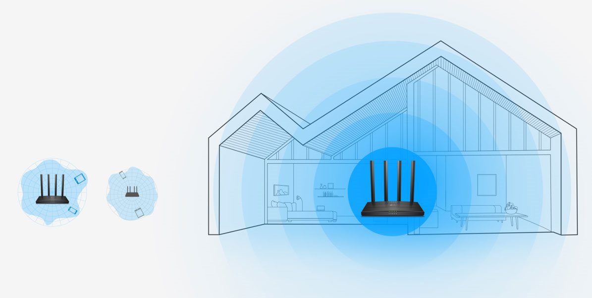 TP-Link Archer C6 V3.2 disponuje štyrmi externými anténami. Vďaka technológii zvanej Beamforming je vysielaný lúč tvarovaný presne tak, aby sa dostatočnou rýchlosťou pripojil blízke aj vzdialené zariadenia. Do všetkých kútov vášho domova tak zamieri ten najlepší možný signál. A najmä v pásme 2,4 GHz dosahuje úctyhodné výsledky pokrytia v porovnaní s konkurenčnými zariadeniami.