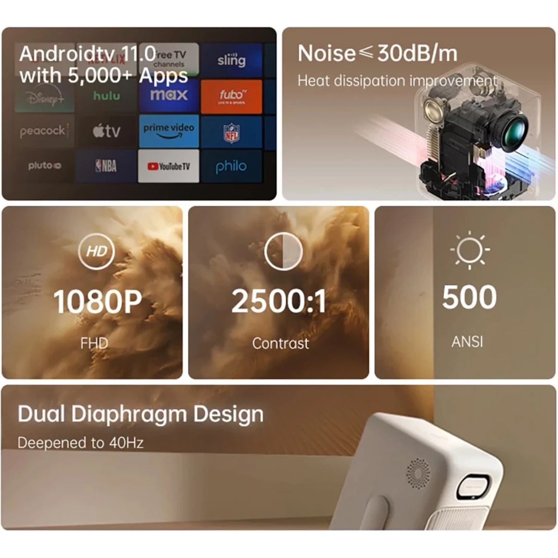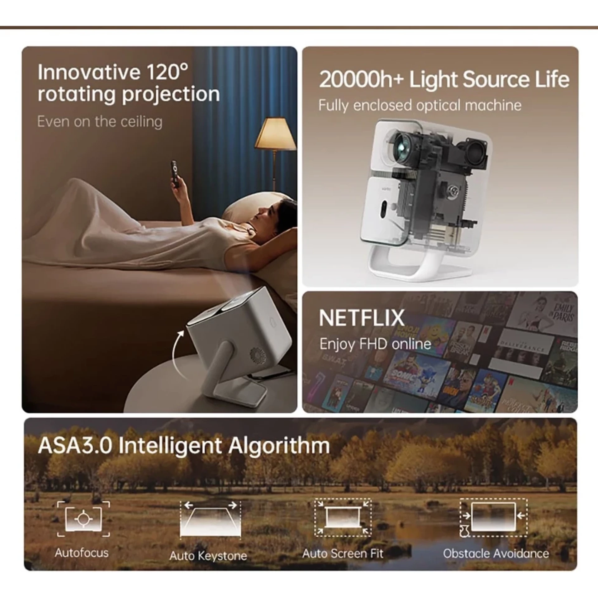 WANBO T2 Ultra je projektor, ktorý poskytuje úžasnú kvalitu obrazu s rozlíšením 1080p . S 500 ANSI lúmenmi si môžete vychutnať čistý obraz aj vo svetlejšej miestnosti. Vďaka ľahkému a kompaktnému dizajnu sa WANBO T2 ULTRA perfektne zmestí do vášho domova, kancelárie alebo konferenčnej miestnosti. Vďaka možnosti otočenie projektora až o 120° si môžete plátno vytvoriť tak na stene ako aj na strope.