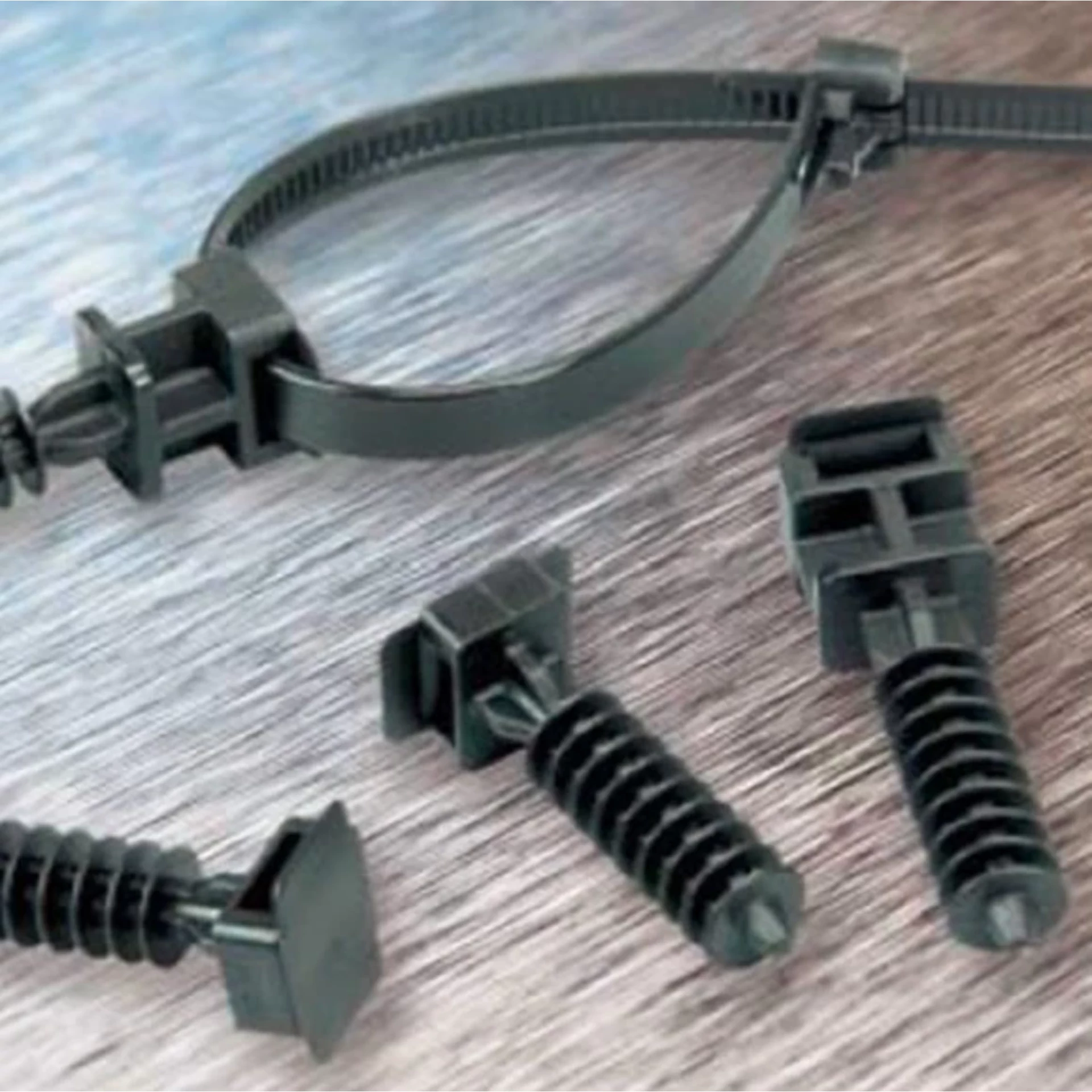 Hmoždinky k pripevneniu káblových zväzkov, drôtov alebo trubiek na steny, stropy z betónu, dreva a iných materiálov pomocou sťahovacích pások.
